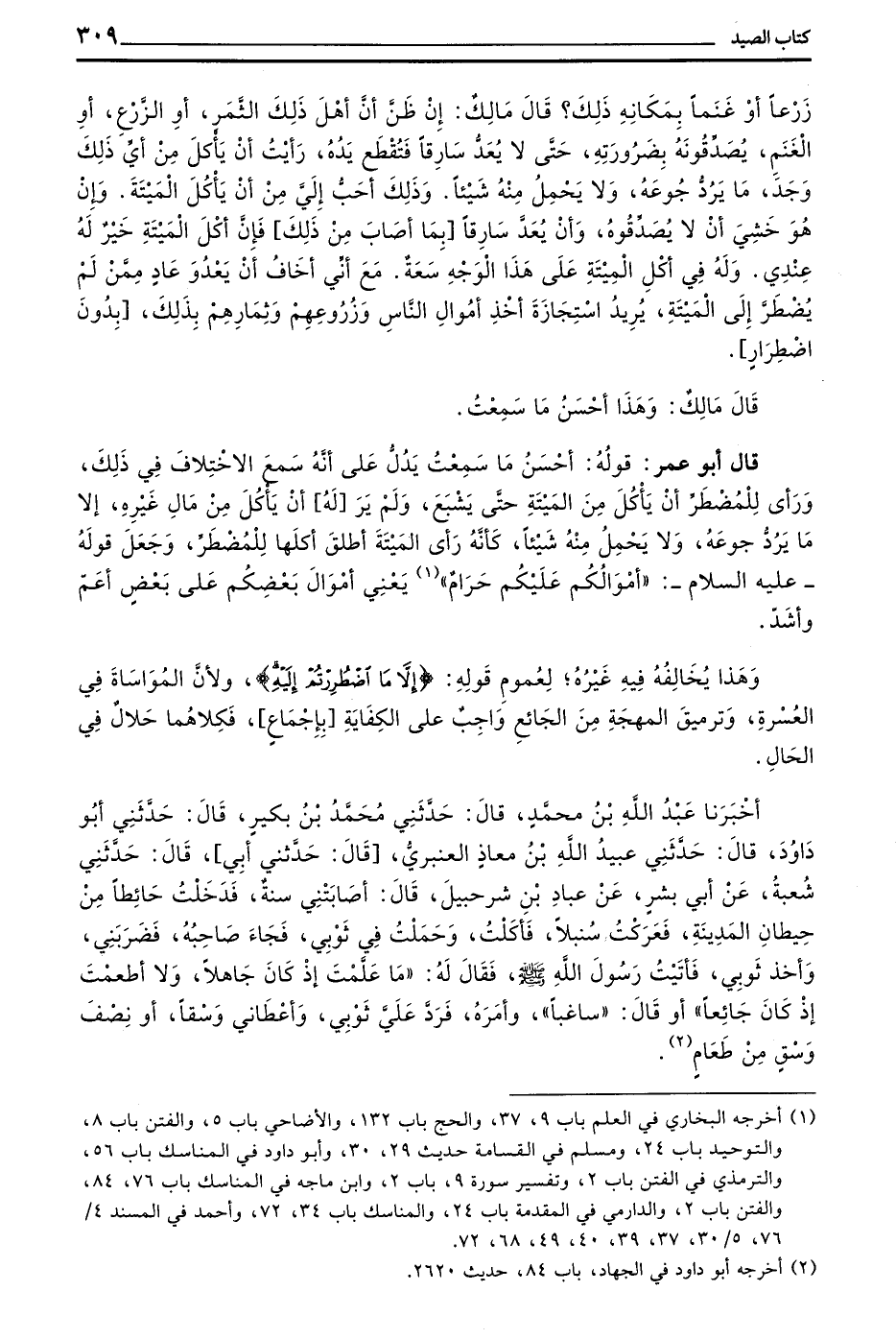 قَالَ أَبُو عُمَرَ قَوْلُهُ أَحْسَنُ مَا سَمِعْتُ يَدُلُّ عَلَى أَنَّهُ سَمِعَ الِاخْتِلَافَ فِي ذَلِكَ وَرَأَى لِلْمُضْطَرِّ أَنْ يَأْكُلَ مِنَ الْمَيْتَةِ حَتَّى يَشْبَعَ وَلَمْ يَرَ لَهُ أَنْ يَأْكُلَ مِنْ مَالِ غَيْرِهِ إِلَّا مَا يَرُدُّ جُوعَهُ وَلَا يَحْمِلُ مِنْهُ شَيْئًا كَأَنَّهُ رَأَى الْمَيْتَةَ أُطْلِقَ أَكْلُهَا لِلْمُضْطَرِّ وَجَعَلَ قَوْلَهُ عَلَيْهِ السَّلَامُ ((أَمْوَالُكُمْ عَلَيْكُمْ حَرَامٌ)) يَعْنِي أَمْوَالُ بَعْضِكُمْ عَلَى بَعْضٍ أَعَمُّ وَأَشَدُّ