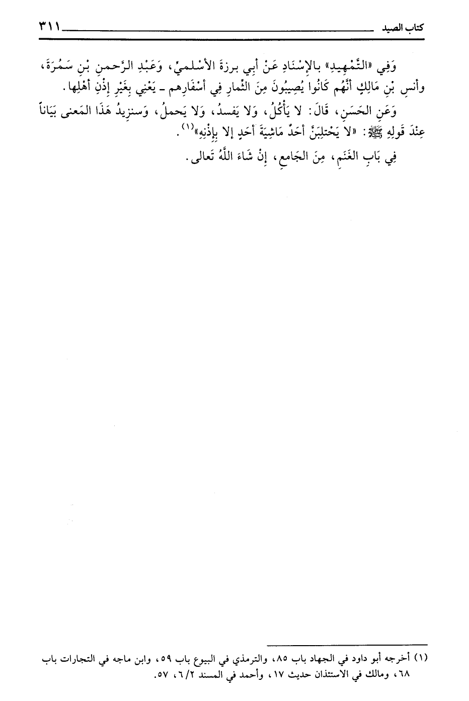 وَفِي ((التَّمْهِيدِ)) بِالْإِسْنَادِ عَنْ أَبِي بَرْزَةَ الْأَسْلَمِيِّ وَعَبْدِ الرَّحْمَنِ بْنِ سَمُرَةَ وَأَنَسِ بْنِ مَالِكٍ أَنَّهُمْ كَانُوا يُصِيبُونَ مِنَ الثِّمَارِ فِي أَسْفَارِهِمْ - يَعْنِي بِغَيْرِ إِذْنِ أَهْلِهَا