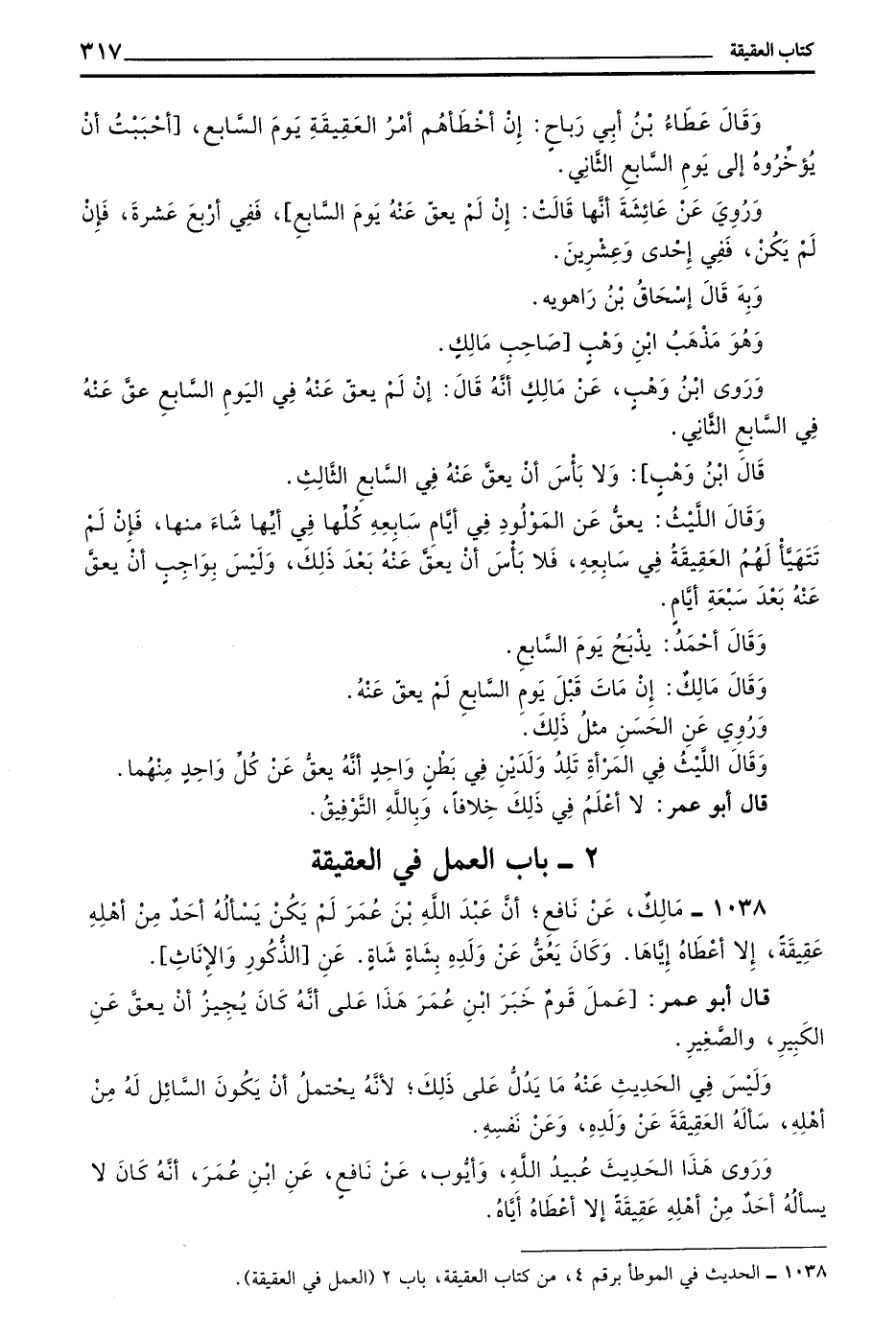 1038 - مَالِكٌ عَنْ نَافِعٍ أَنَّ عَبْدَ اللَّهِ بْنَ عُمَرَ لَمْ يَكُنْ يَسْأَلُهُ أَحَدٌ مِنْ أَهْلِهِ عَقِيقَةً إِلَّا أَعْطَاهُ إِيَّاهَا وَكَانَ يَعُقُّ عَنْ وَلَدِهِ بِشَاةٍ شَاةٍ عَنِ الذُّكُورِ وَالْإِنَاثِ