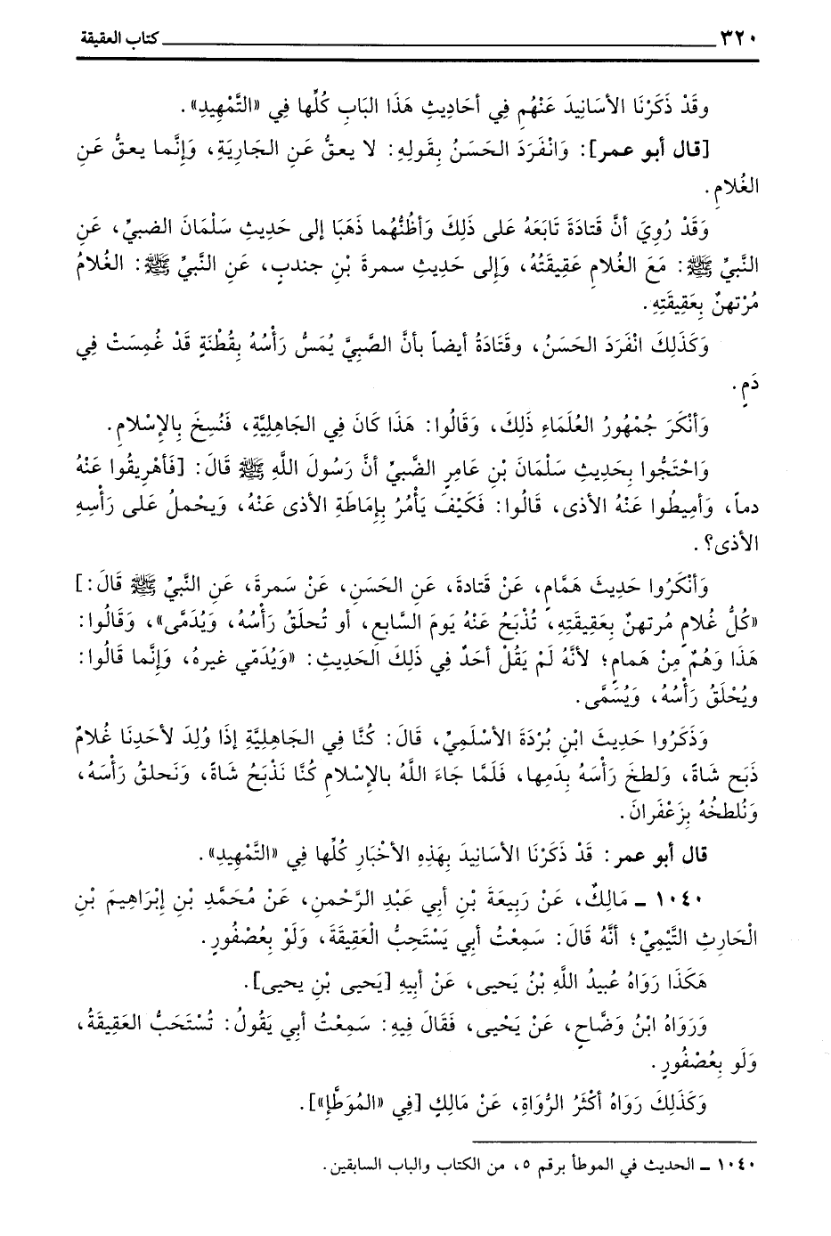 1040 - مَالِكٌ عَنْ رَبِيعَةَ بْنِ أَبِي عَبْدِ الرَّحْمَنِ عَنْ مُحَمَّدِ بْنِ إِبْرَاهِيمَ بْنِ الْحَارِثِ التَّيْمِيِّ أَنَّهُ قَالَ سَمِعْتُ أَبِي يَسْتَحِبُّ الْعَقِيقَةَ وَلَوْ بِعُصْفُورٍ