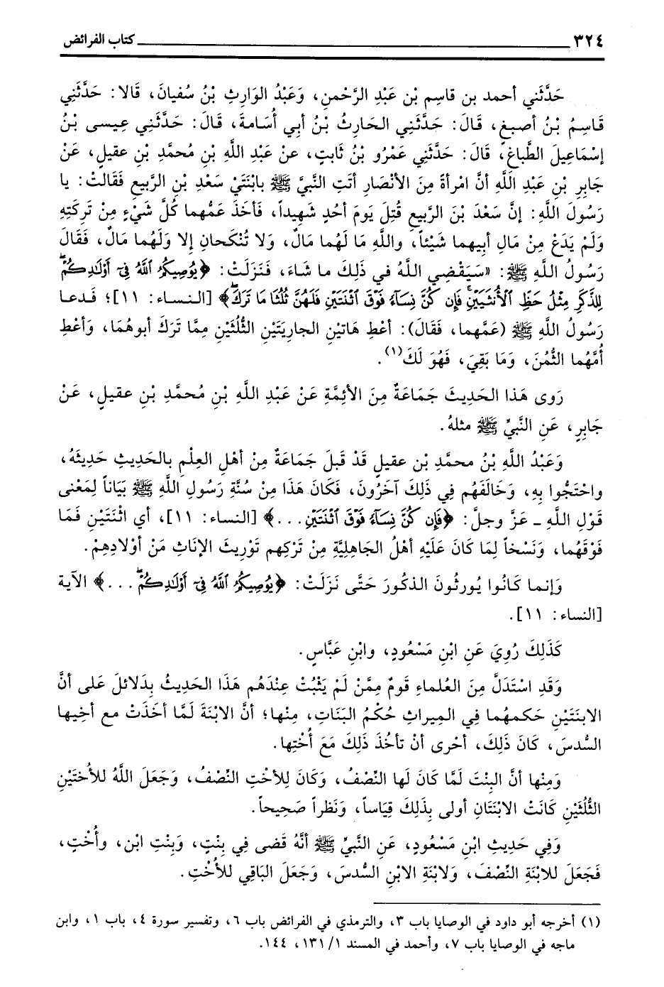 حَدَّثَنِي أَحْمَدُ بْنُ قَاسِمِ بْنِ عَبْدِ الرَّحْمَنِ وَعَبْدُ الْوَارِثِ بْنُ سُفْيَانَ قَالَا حَدَّثَنِي قَاسِمُ بْنُ أَصْبَغَ قَالَ حَدَّثَنِي الْحَارِثُ بْنُ أَبِي اسامة قال حدثني عيسى بن إسماعيل الطباغ قَالَ حَدَّثَنِي عَمْرُو بْنُ ثَابِتٍ عَنْ عَبْدِ اللَّهِ بْنِ مُحَمَّدِ بْنِ عَقِيلٍ عن جابر بْنِ عَبْدِ اللَّهِ أَنَّ امْرَأَةً مِنَ الْأَنْصَارِ أَتَتِ النَّبِيَّ صَلَّى اللَّهُ عَلَيْهِ وَسَلَّمَ بِابْنَتَيْ سَعْدِ بْنِ الرَّبِيعِ فَقَالَتْ يَا رَسُولَ اللَّهِ إِنْ سَعْدَ بْنَ الرَّبِيعِ قُتِلَ يَوْمَ أُحُدٍ شَهِيدًا فَأَخَذَ عَمُّهُمَا كُلَّ شَيْءٍ مِنْ تَرِكَتِهِ وَلَمْ يَدَعْ مِنْ مَالِ أَبِيهِمَا شَيْئًا وَاللَّهِ ما لهما مال ولا تنكحان إلا ولهما مَالٌ فَقَالَ رَسُولُ اللَّهِ صَلَّى اللَّهُ عَلَيْهِ وَسَلَّمَ ((سَيَقْضِي اللَّهُ فِي ذَلِكَ مَا شَاءَ فنزلت (يوصيكم الله في أولادكم للذكر مثل حَظِّ الْأُنْثَيَيْنِ فَإِنْ كُنَّ نِسَاءً فَوْقَ اثْنَتَيْنِ فَلَهُنَّ ثُلُثَا مَا تَرَكَ) النِّسَاءِ 11 فَدَعَا رَسُولُ اللَّهِ صَلَّى اللَّهُ عَلَيْهِ وَسَلَّمَ (عَمَّهُمَا فَقَالَ) أَعْطِ هَاتَيْنِ الْجَارِيَتَيْنِ الثُّلُثَيْنِ مِمَّا تَرَكَ أَبُوهُمَا وأعط أمهما الثمن وما بقي فهو لك