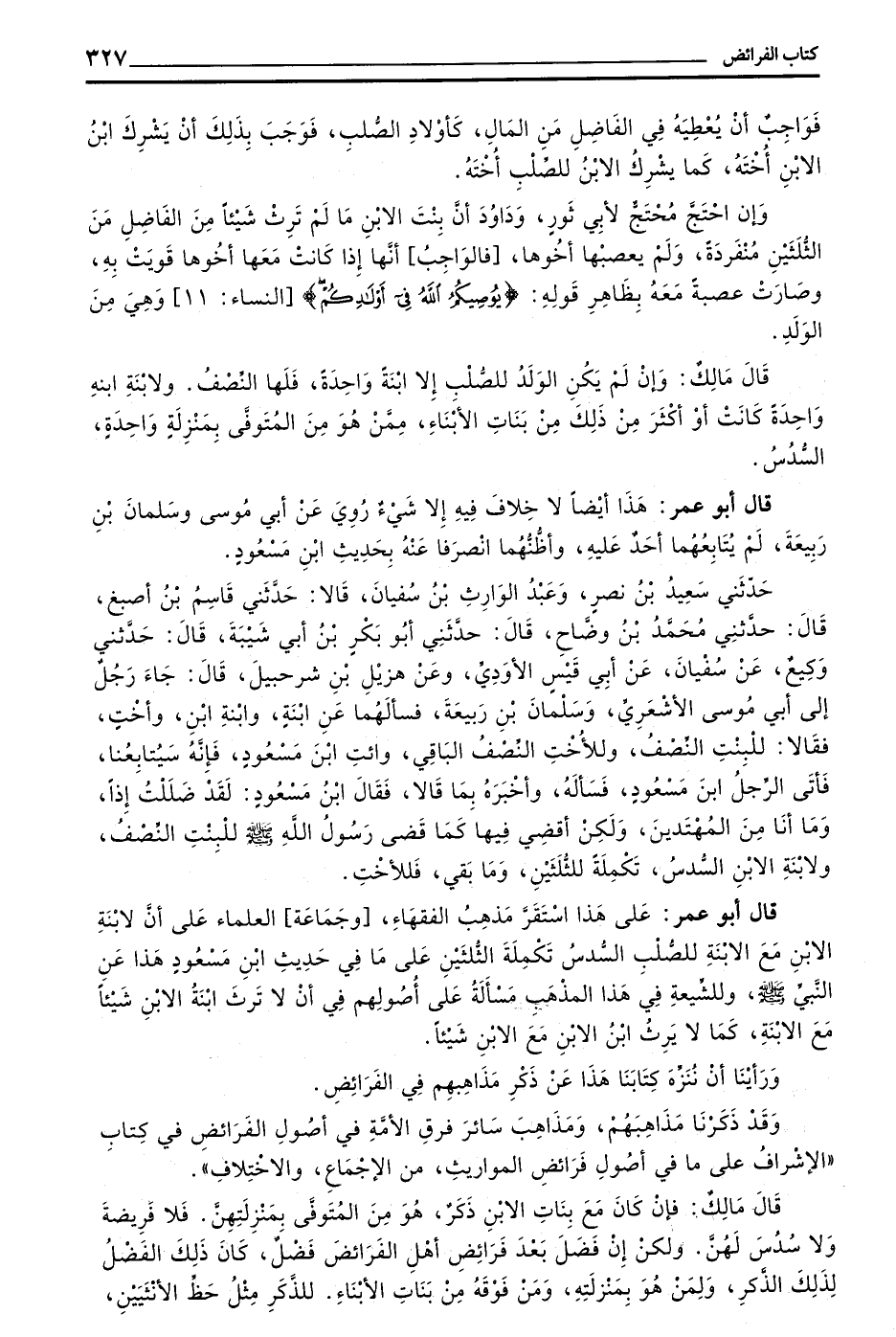 قَالَ أَبُو عُمَرَ عَلَى هَذَا اسْتَقَرَّ مَذْهَبُ الْفُقَهَاءِ وَجَمَاعَةُ الْعُلَمَاءِ عَلَى أَنَّ لِابْنَةِ الِابْنِ مَعَ الِابْنَةِ لِلصُّلْبِ السُّدُسَ تَكْمِلَةَ الثُّلُثَيْنِ على ما في حديث بن مَسْعُودٍ هَذَا عَنِ النَّبِيِّ صَلَّى اللَّهُ عَلَيْهِ وَسَلَّمَ وَلِلشِّيعَةِ فِي هَذَا الْمَذْهَبِ مَسْأَلَةٌ عَلَى أُصُولِهِمْ فِي أَنْ لَا تَرِثَ ابْنَةُ الِابْنِ شيئا مع الابنة كما لا يرث بن الِابْنِ مَعَ الِابْنِ شَيْئًا