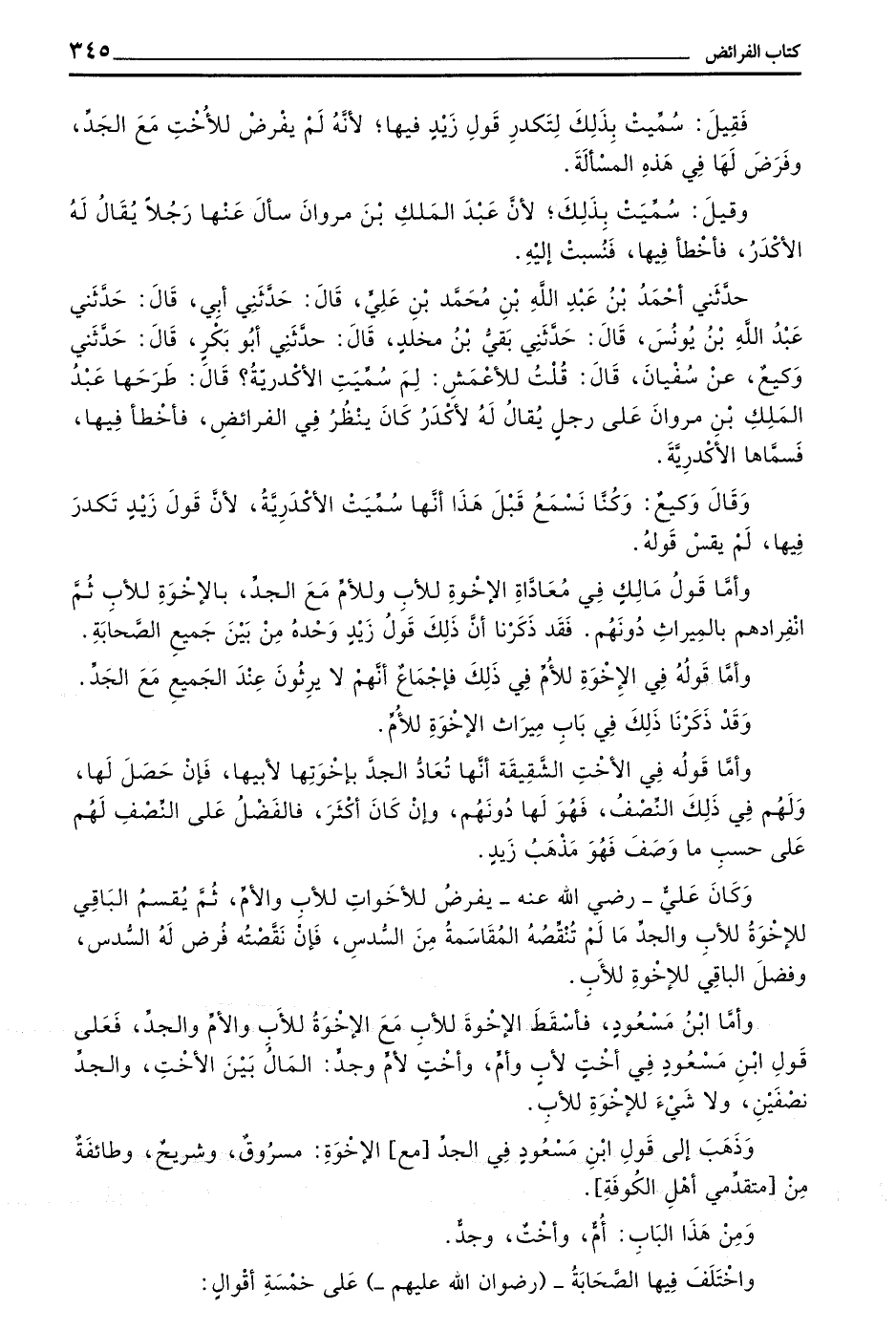 وَكَانَ عَلِيٌّ - رَضِيَ اللَّهُ عَنْهُ - يَفْرِضُ لِلْأَخَوَاتِ لِلْأَبِ وَالْأُمِّ ثُمَّ يَقْسِمُ الْبَاقِي لِلْإِخْوَةِ لِلْأَبِ وَالْجَدِّ مَا لَمْ تَنْقُصْهُ الْمُقَاسَمَةُ مِنَ السُّدُسِ فَإِنْ نَقَصَتْهُ فُرِضَ لَهُ السُّدُسُ وَفَضَلَ الْبَاقِي لِلْإِخْوَةِ لِلْأَبِ