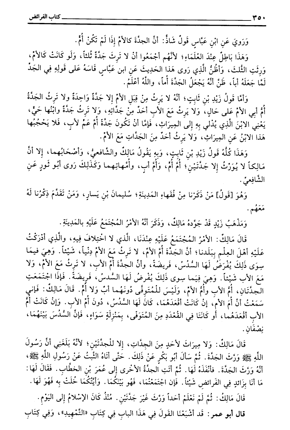 وَهَذَا كُلُّهُ قَوْلُ زَيْدِ بْنِ ثَابِتٍ وَبِهِ يَقُولُ مَالِكٌ وَالشَّافِعِيُّ وَأَصْحَابُهُمَا إِلَّا أَنَّ مَالِكًا لَا يُوَرِّثُ إِلَّا جَدَّتَيْنِ أُمَّ أُمٍّ وَأُمَّ أَبٍ وَأُمَّهَاتِهِمَا وَكَذَلِكَ رَوَى أَبُو ثَوْرٍ عَنِ الشَّافِعِيِّ