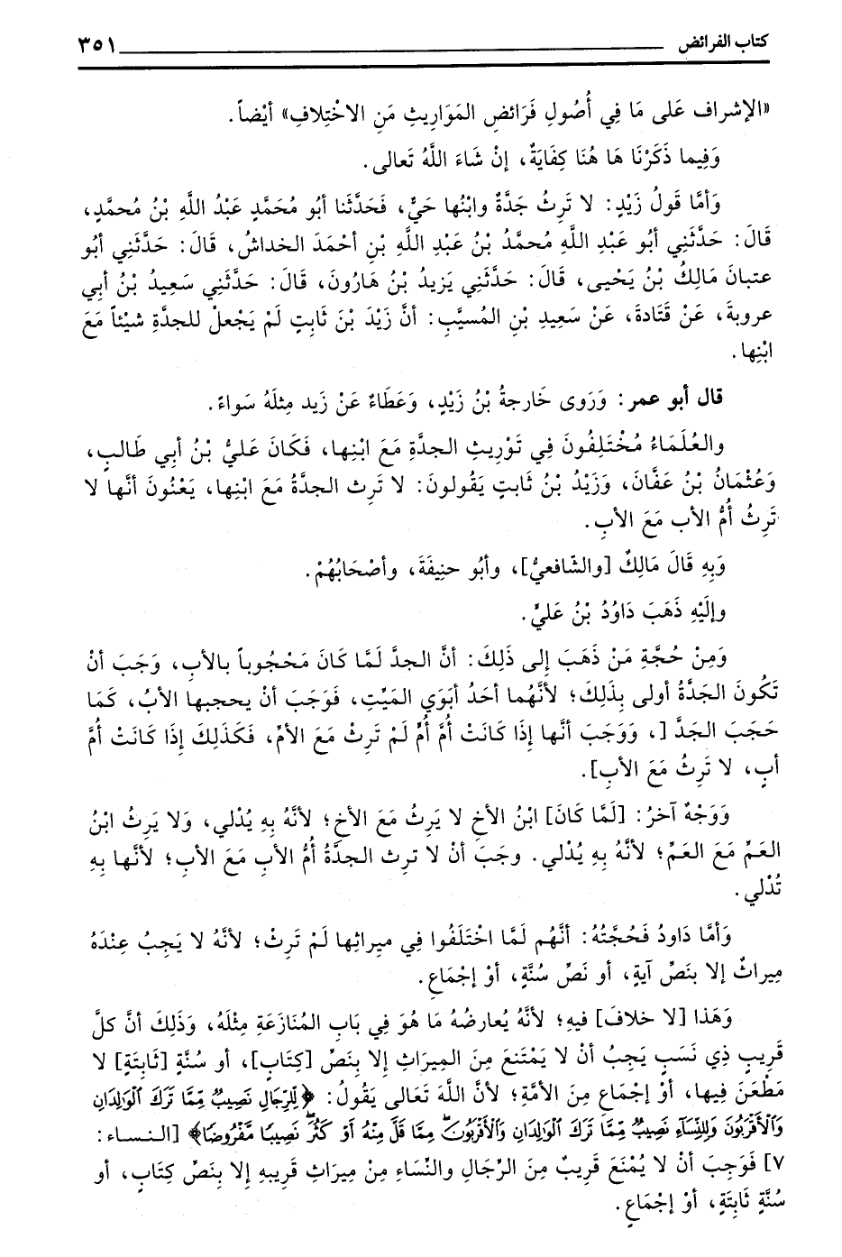 وَهَذَا لَا خِلَافَ فِيهِ لِأَنَّهُ يُعَارِضُهُ مَا هُوَ فِي بَابِ الْمُنَازَعَةِ مِثْلُهُ وَذَلِكَ أَنَّ كُلَّ قَرِيبٍ ذِي نَسَبٍ يَجِبُ أَنْ لَا يَمْتَنِعَ مِنَ الْمِيرَاثِ إِلَّا بِنَصِّ كِتَابٍ أَوْ سُنَّةٍ ثَابِتَةٍ لَا مَطْعَنَ فِيهَا أَوْ إِجْمَاعٍ مِنَ الْأُمَّةِ لِأَنَّ اللَّهَ تَعَالَى يَقُولُ (لِلرِّجَالِ نَصِيبٌ مِمَّا تَرَكَ الْوَالِدَانِ وَالْأَقْرَبُونَ وَلِلنِّسَاءِ نَصِيبٌ مِمَّا تَرَكَ الْوَالِدَانِ وَالْأَقْرَبُونَ مِمَّا قَلَّ مِنْهُ أَوْ كَثُرَ نَصِيبًا مَفْرُوضًا) النِّسَاءِ 7 فَوَجَبَ أَنْ لَا يُمْنَعُ قَرِيبٌ مِنَ الرِّجَالِ وَالنِّسَاءِ مِنْ مِيرَاثِ قَرِيبِهِ إِلَّا بِنَصِّ كِتَابٍ أَوْ سُنَّةٍ ثَابِتَةٍ أو إجماع