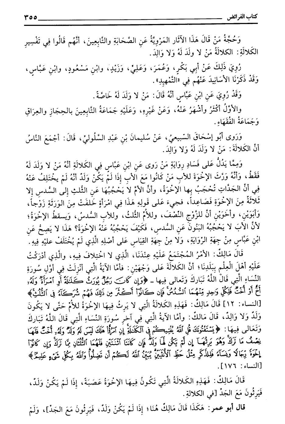 قَالَ مَالِكٌ الْأَمْرُ الْمُجْتَمَعُ عَلَيْهِ عِنْدَنَا الَّذِي لَا اخْتِلَافَ فِيهِ وَالَّذِي أَدْرَكْتُ عَلَيْهِ أَهْلَ الْعِلْمِ بِبَلَدِنَا أَنَّ الْكَلَالَةَ عَلَى وَجْهَيْنِ فَأَمَّا الْآيَةُ الَّتِي أُنْزِلَتْ فِي أَوَّلِ سُورَةِ النِّسَاءِ الَّتِي قَالَ اللَّهُ تَبَارَكَ وَتَعَالَى فِيهَا - (وَإِنْ كَانَ رَجُلٌ يُورَثُ كَلَالَةً أَوِ امْرَأَةٌ وَلَهُ أَخٌ أَوْ أُخْتٌ فَلِكُلِّ وَاحِدٍ مِنْهُمَا السُّدُسُ فَإِنْ كَانُوا أَكْثَرَ مِنْ ذَلِكَ فَهُمْ شُرَكَاءُ فِي الثُّلُثِ) النِّسَاءِ 12 قَالَ مَالِكٌ فَهَذِهِ الْكَلَالَةُ الَّتِي لَا يَرِثُ فِيهَا الْإِخْوَةُ لِلْأُمِّ حَتَّى لَا يَكُونَ وَلَدٌ وَلَا وَالِدٌ قَالَ مالك فأما الْآيَةُ الَّتِي فِي آخِرِ سُورَةِ النِّسَاءِ الَّتِي قَالَ اللَّهُ تَبَارَكَ وَتَعَالَى فِيهَا (يَسْتَفْتُونَكَ قُلِ الله يفتيكم في الكلالة إن امرؤا هَلَكَ لَيْسَ لَهُ وَلَدٌ وَلَهُ أُخْتٌ فَلَهَا نِصْفُ مَا تَرَكَ وَهُوَ يَرِثُهَا إِنْ لَمْ يَكُنْ لَهَا وَلَدٌ فَإِنْ كَانَتَا اثْنَتَيْنِ فَلَهُمَا الثُّلُثَانِ مِمَّا تَرَكَ وَإِنْ كَانُوا إِخْوَةً رِجَالًا وَنِسَاءً فَلِلذَّكَرِ مِثْلُ حَظِّ الْأُنْثَيَيْنِ يُبَيِّنُ اللَّهُ لَكُمْ أَنْ تَضِلُّوا وَاللَّهُ بِكُلِّ شَيْءٍ عَلِيمٌ) النِّسَاءِ 176