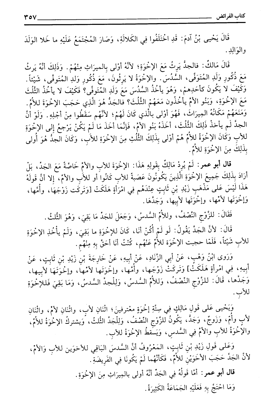 قَالَ أَبُو عُمَرَ لَمْ يُرِدْ مَالِكٌ بِقَوْلِهِ هَذَا الْإِخْوَةَ لِلْأَبِ وَالْأُمِّ خَاصَّةً مَعَ الْجَدِّ بَلْ أَرَادَ بِذَلِكَ جَمِيعَ الْإِخْوَةِ الَّذِينَ يَكُونُونَ عَصَبَةً لِلْأَبِ كَانُوا أَوْ لِلْأَبِ وَالْأُمِّ إِلَّا أَنَّ قَوْلَهُ هَذَا لَيْسَ عَلَى مَذْهَبِ زَيْدِ بْنِ ثَابِتٍ عِنْدَهُمْ فِي امْرَأَةٍ هَلَكَتْ وَتَرَكَتْ زَوْجَهَا وَأُمَّهَا وَإِخْوَتَهَا لِأُمِّهَا وَإِخْوَتَهَا لِأَبِيهَا وَجَدَّهَا