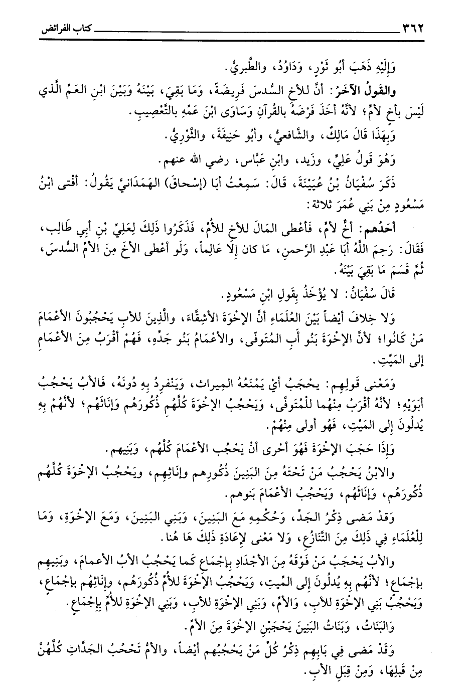 وَالِابْنُ يَحْجُبُ مَنْ تَحْتَهُ مِنَ الْبَنِينَ ذُكُورِهُمْ وَإِنَاثِهُمْ وَيَحْجُبُ الْإِخْوَةَ كُلَّهُمْ ذُكُورَهُمْ وَإِنَاثَهُمْ وَيَحْجُبُ الْأَعْمَامَ بَنُوهُمْ