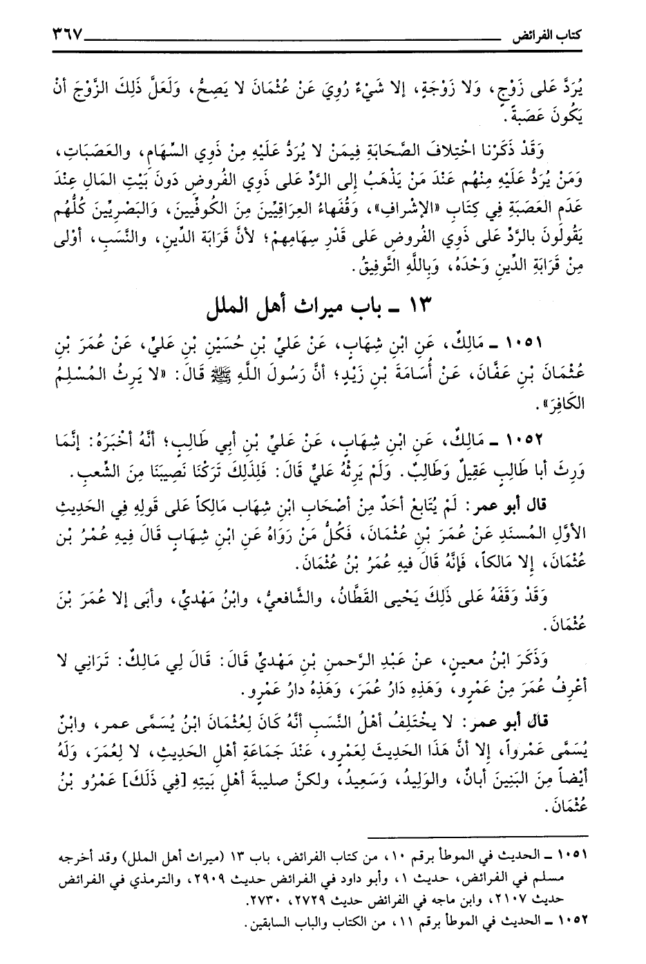 1051 - مالك عن بن شِهَابٍ عَنْ عَلِيِّ بْنِ حُسَيْنِ بْنِ عَلِيٍّ عَنْ عُمَرَ بْنِ عُثْمَانَ بْنِ عَفَّانَ عَنْ أُسَامَةَ بْنِ زَيْدٌ أَنَّ رَسُولَ اللَّهِ صَلَّى اللَّهُ عَلَيْهِ وَسَلَّمَ قَالَ ((لَا يَرِثُ الْمُسْلِمُ الكافر))