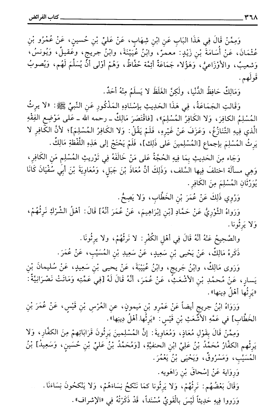 وَجَاءَ مِنَ الْحَدِيثِ بِمَا فِيهِ الْحُجَّةُ عَلَى مَنْ خَالَفَهُ فِي تَوْرِيثِ الْمُسْلِمِ مِنَ الْكَافِرِ وَهِيَ مَسْأَلَةٌ اخْتَلَفَ فِيهَا السَّلَفُ وَذَلِكَ أَنَّ مُعَاذَ بْنَ جَبَلٍ وَمُعَاوِيَةَ بْنَ أَبِي سُفْيَانَ كَانَا يُوَرَّثَانِ الْمُسْلِمَ مِنَ الْكَافِرِ
