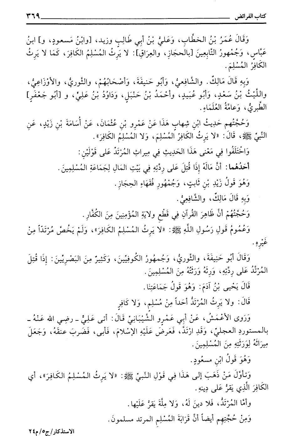 وَقَالَ عُمَرَ بْنِ الْخَطَّابِ وَعَلِيِّ بْنِ أَبِي طَالِبٍ وزيد وبن مسعود وبن عَبَّاسٍ وَجُمْهُورُ التَّابِعِينَ بِالْحِجَازِ وَالْعِرَاقِ لَا يَرِثُ الْمُسْلِمُ الْكَافِرَ كَمَا لَا يَرِثُ الْكَافِرُ الْمُسْلِمَ