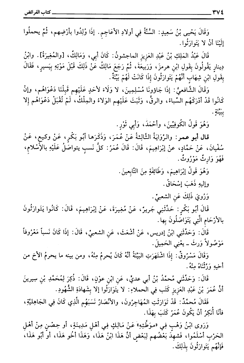 قَالَ وَحَدَّثَنِي مُحَمَّدُ بن أبي عدي عن بن عَوْنٍ قَالَ ذُكِرَ لِمُحَمَّدِ بْنِ سِيرِينَ أَنَّ عُمَرَ بْنَ عَبْدِ الْعَزِيزِ كَتَبَ فِي الْحُمَلَاءِ لا يتوارثوا إِلَّا بِشَهَادَةِ الشُّهُودِ