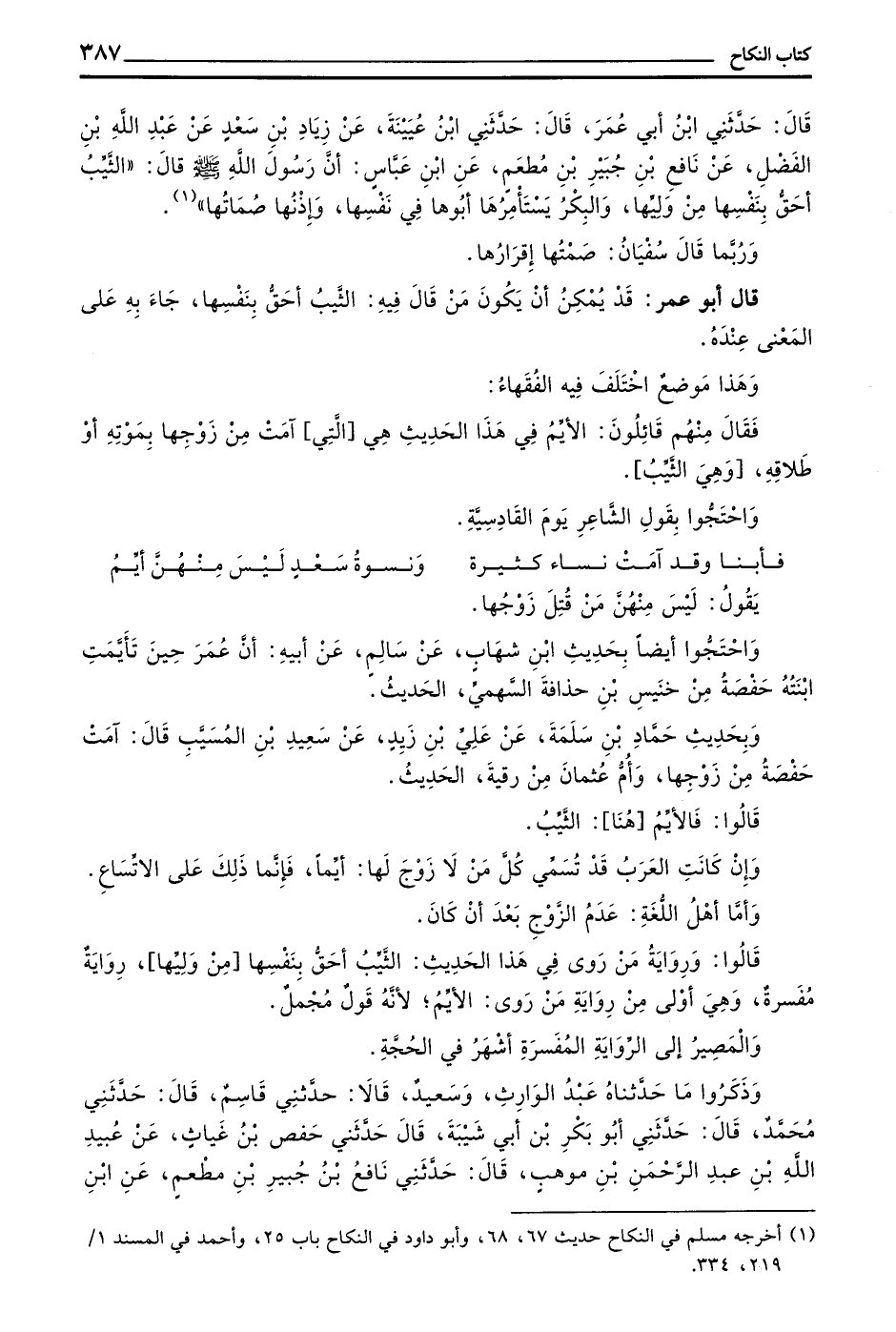 قال حدثني بن أبي عمر قال حدثني بْنُ عُيَيْنَةَ عَنْ زِيَادِ بْنِ سَعْدٍ عَنْ عَبْدِ اللَّهِ بْنِ الْفَضْلِ عَنْ نَافِعِ بْنِ جُبَيْرِ بْنِ مُطْعِمٍ عَنْ بْنِ عَبَّاسٍ أَنَّ رَسُولَ اللَّهِ صَلَّى اللَّهُ عَلَيْهِ وَسَلَّمَ قَالَ الثَّيِّبُ أَحَقُّ بِنَفْسِهَا مِنْ وَلِيِّهَا وَالْبِكْرُ يَسْتَأْمِرُهَا أَبُوهَا فِي نَفْسِهَا وَإِذْنُهَا صُمَاتُهَا))