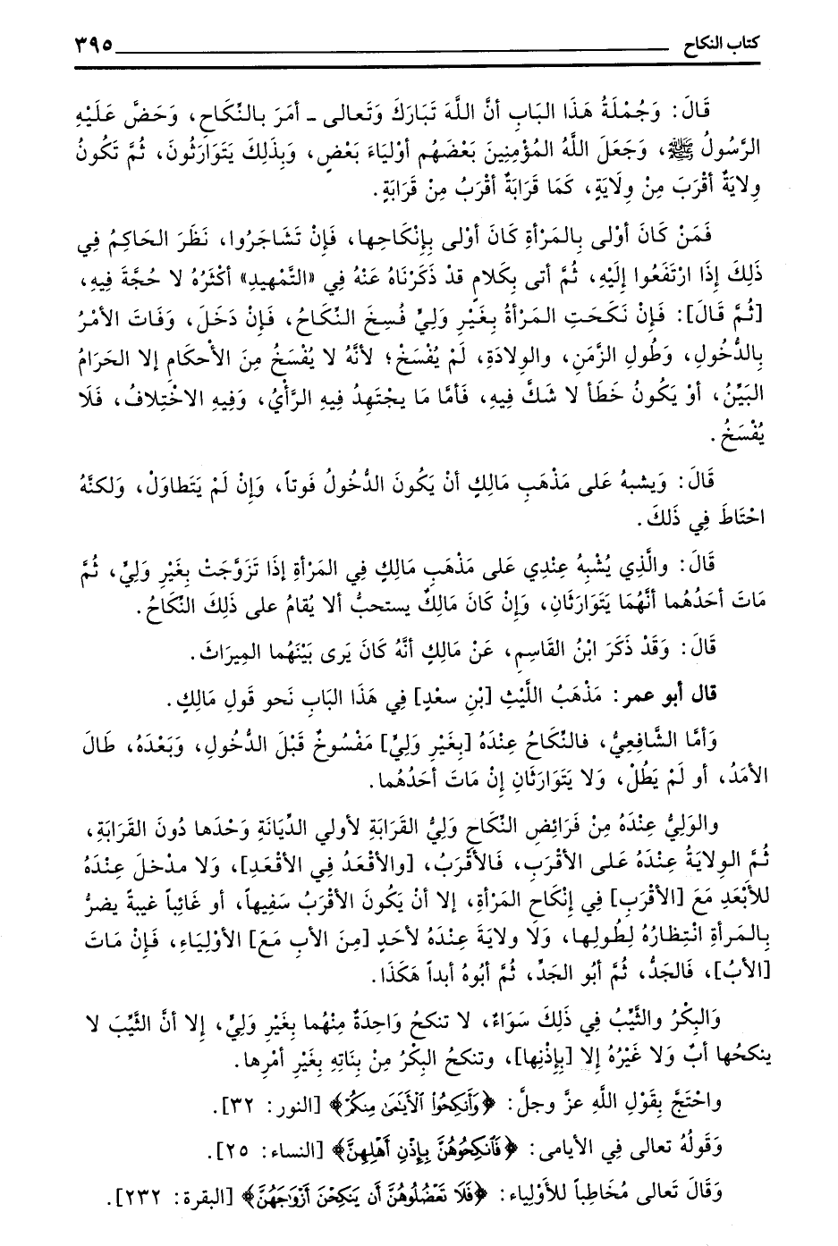 قَالَ وَجُمْلَةُ هَذَا الْبَابِ أَنَّ اللَّهَ تَبَارَكَ وَتَعَالَى - أَمَرَ بِالنِّكَاحِ وَحَضَّ عَلَيْهِ الرَّسُولُ صَلَّى اللَّهُ عَلَيْهِ وَسَلَّمَ وَجَعَلَ اللَّهُ الْمُؤْمِنِينَ بَعْضَهُمْ أَوْلِيَاءَ بَعْضٍ وَبِذَلِكَ يَتَوَارَثُونَ ثُمَّ تَكُونُ وِلَايَةٌ أَقْرَبَ مِنْ وِلَايَةٍ كَمَا قَرَابَةٌ أَقْرَبُ مِنْ قَرَابَةٍ