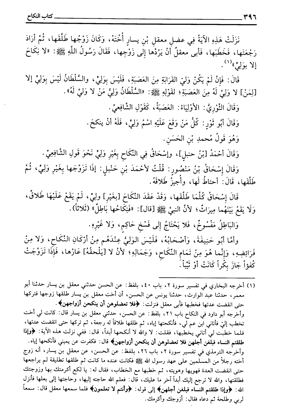نَزَلَتْ هَذِهِ الْآيَةُ فِي عَضْلِ مَعْقِلِ بْنِ يَسَارٍ أُخْتَهُ وَكَانَ زَوْجُهَا طَلَّقَهَا ثُمَّ أَرَادَ رَجْعَتَهَا فَخَطَبَهَا فَأَبَى مَعْقِلٌ أَنْ يَرُدَّهَا إِلَى زَوْجِهَا فَقَالَ رَسُولُ اللَّهِ صَلَّى اللَّهُ عَلَيْهِ وَسَلَّمَ ((لَا نِكَاحَ إِلَّا بِوَلِيٍّ))
