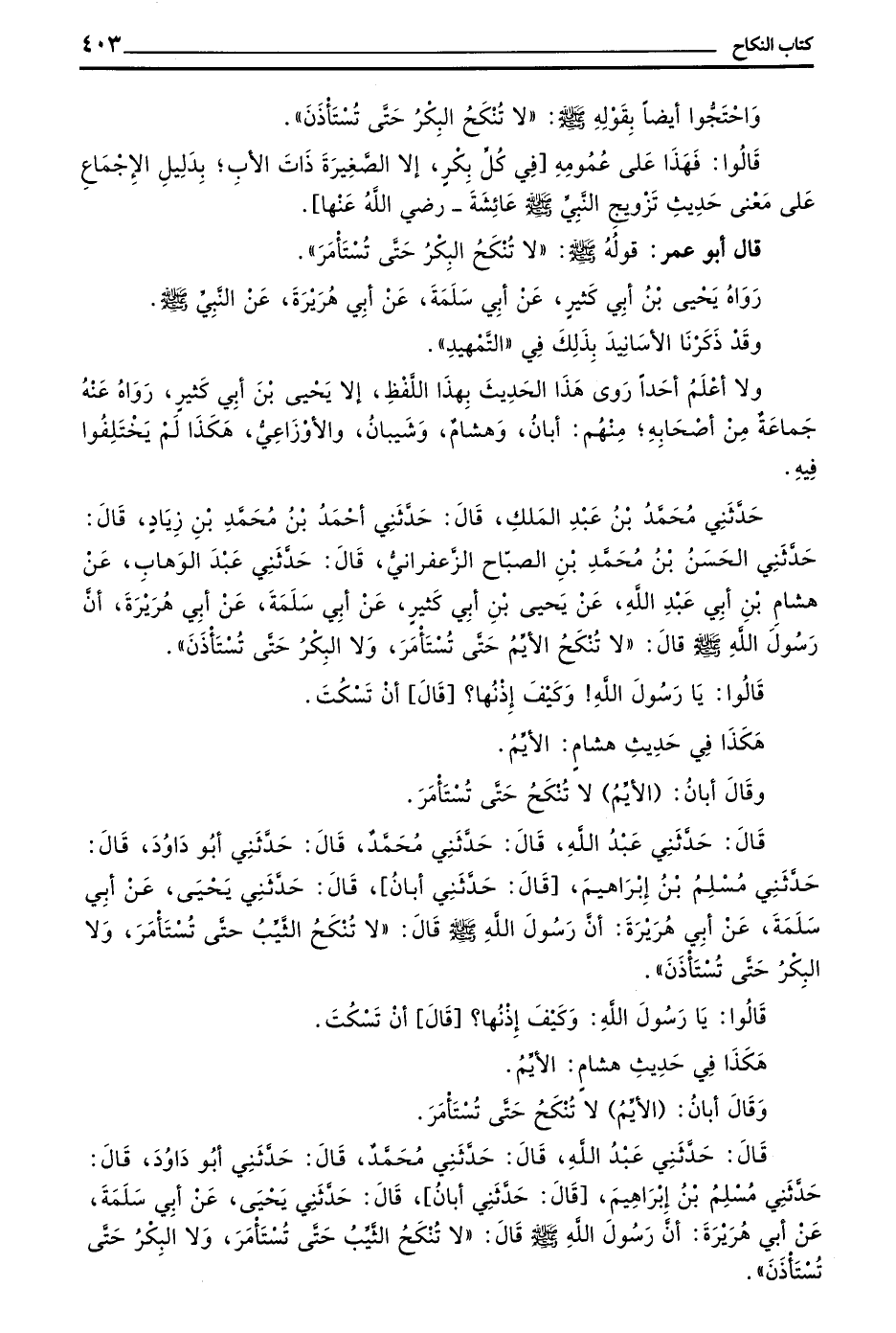 قَالَ حَدَّثَنِي عَبْدُ اللَّهِ قَالَ حَدَّثَنِي مُحَمَّدٌ قَالَ حَدَّثَنِي أَبُو دَاوُدَ قَالَ حَدَّثَنِي مُسْلِمُ بْنُ إِبْرَاهِيمَ قَالَ حَدَّثَنِي أَبَانٌ قَالَ حَدَّثَنِي يَحْيَى عَنْ أَبِي سَلَمَةَ عَنْ أَبِي هُرَيْرَةَ أَنَّ رَسُولَ اللَّهِ صَلَّى اللَّهُ عَلَيْهِ وَسَلَّمَ قَالَ ((لَا تُنْكَحُ الثَّيِّبُ حَتَّى تُسْتَأْمَرَ وَلَا الْبِكْرُ حَتَّى تُسْتَأْذَنَ))