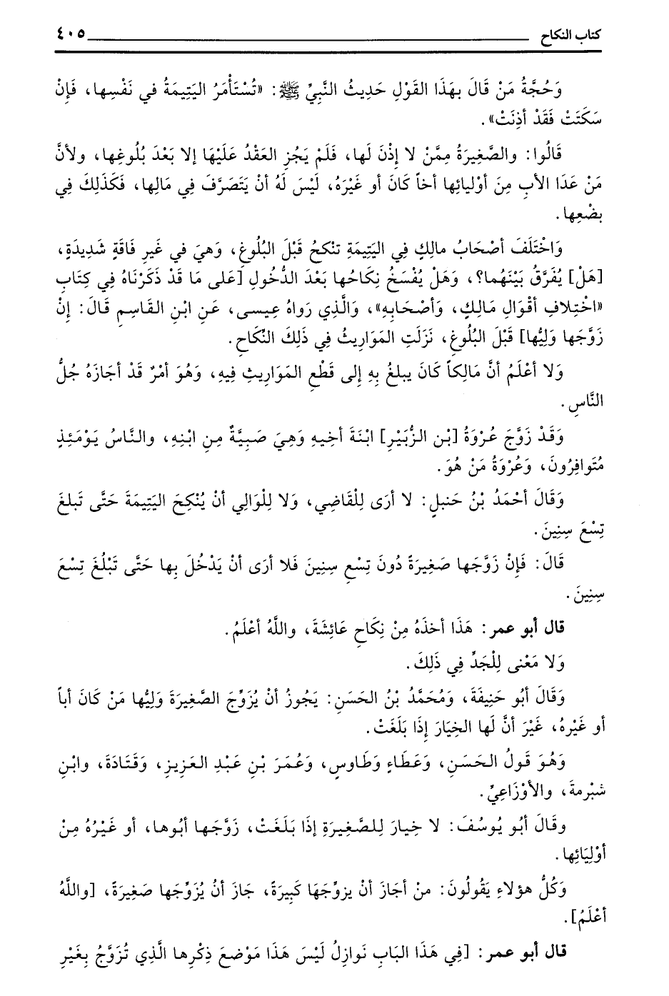 وَقَالَ أَحْمَدُ بْنُ حنبل لا أرى للقاضي ولا للوالي أَنْ يُنْكِحَ الْيَتِيمَةَ حَتَّى تَبْلُغَ تِسْعَ سِنِينَ