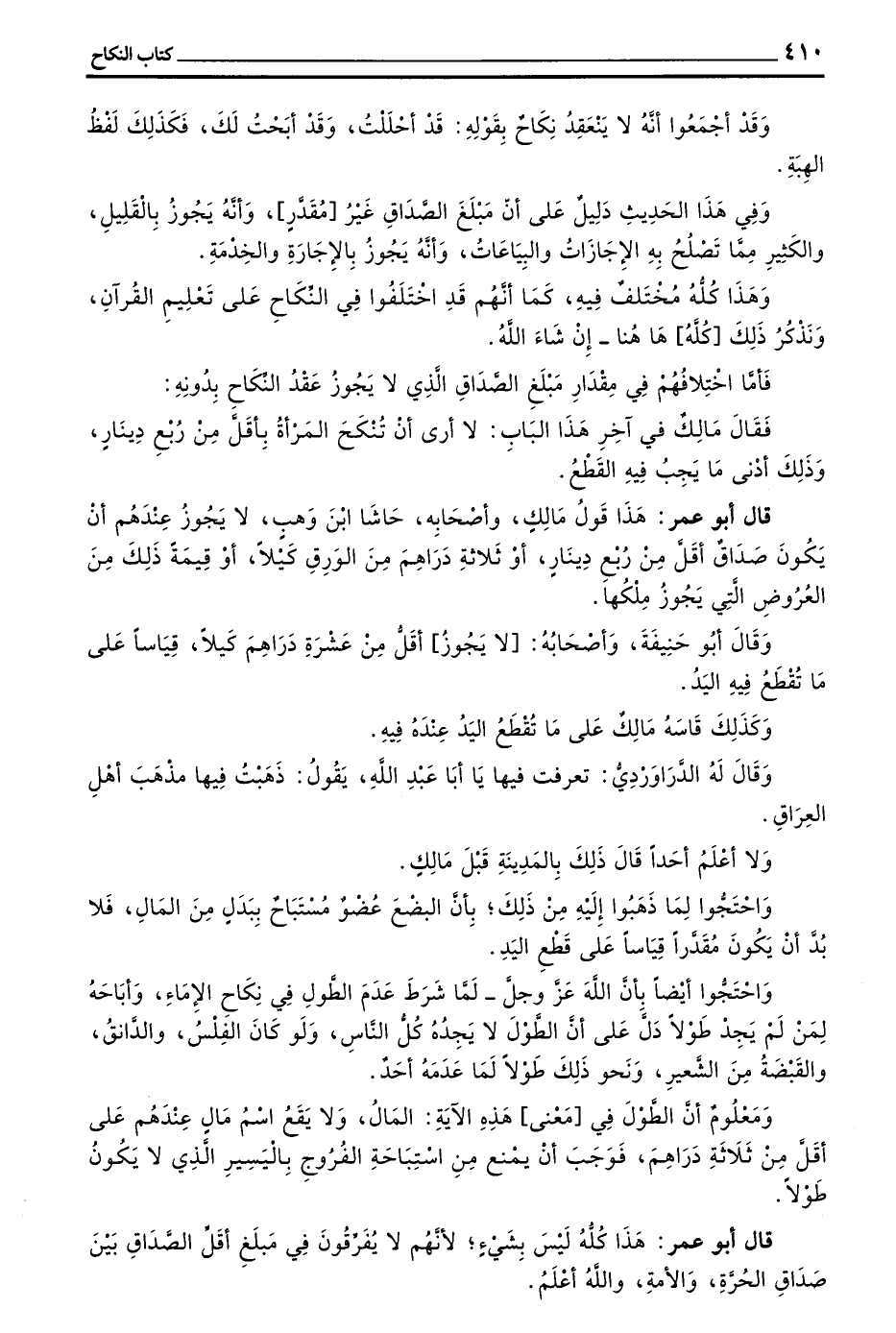 قَالَ أَبُو عُمَرَ هَذَا قَوْلُ مَالِكٍ وأصحابه حاشا بن وَهْبٍ لَا يَجُوزُ عِنْدَهُمْ أَنْ يَكُونَ صَدَاقٌ أَقَلَّ مِنْ رُبُعِ دِينَارٍ أَوْ ثَلَاثَةِ دَرَاهِمَ كيلا من الورق أَوْ قِيمَةِ ذَلِكَ مِنَ الْعُرُوضِ الَّتِي يَجُوزُ مِلْكُهَا