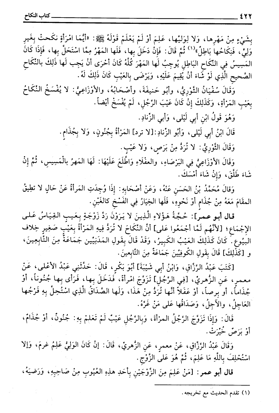 كتب عبد الرزاق وبن أَبِي شَيْبَةَ أَبُو بَكْرٍ قَالَ حَدَّثَنِي عَبْدُ الْأَعْلَى عَنْ مَعْمَرٍ عَنِ الزُّهْرِيِّ فِي الرَّجُلِ تَزَوَّجَ امْرَأَةً فَدَخَلَ بِهَا فَرَأَى بِهَا جُنُونًا أَوْ جُذَامًا أَوْ بَرَصًا أَوْ عَفَلًا أَنَّهَا تُرَدُّ مِنْ هَذَا وَلَهَا الصَّدَاقُ الَّذِي اسْتَحَلَّ بِهِ فَرَجَهَا الْعَاجِلُ وَالْآجِلُ وَصَدَاقُهَا عَلَى مَنْ غَرَّهُ