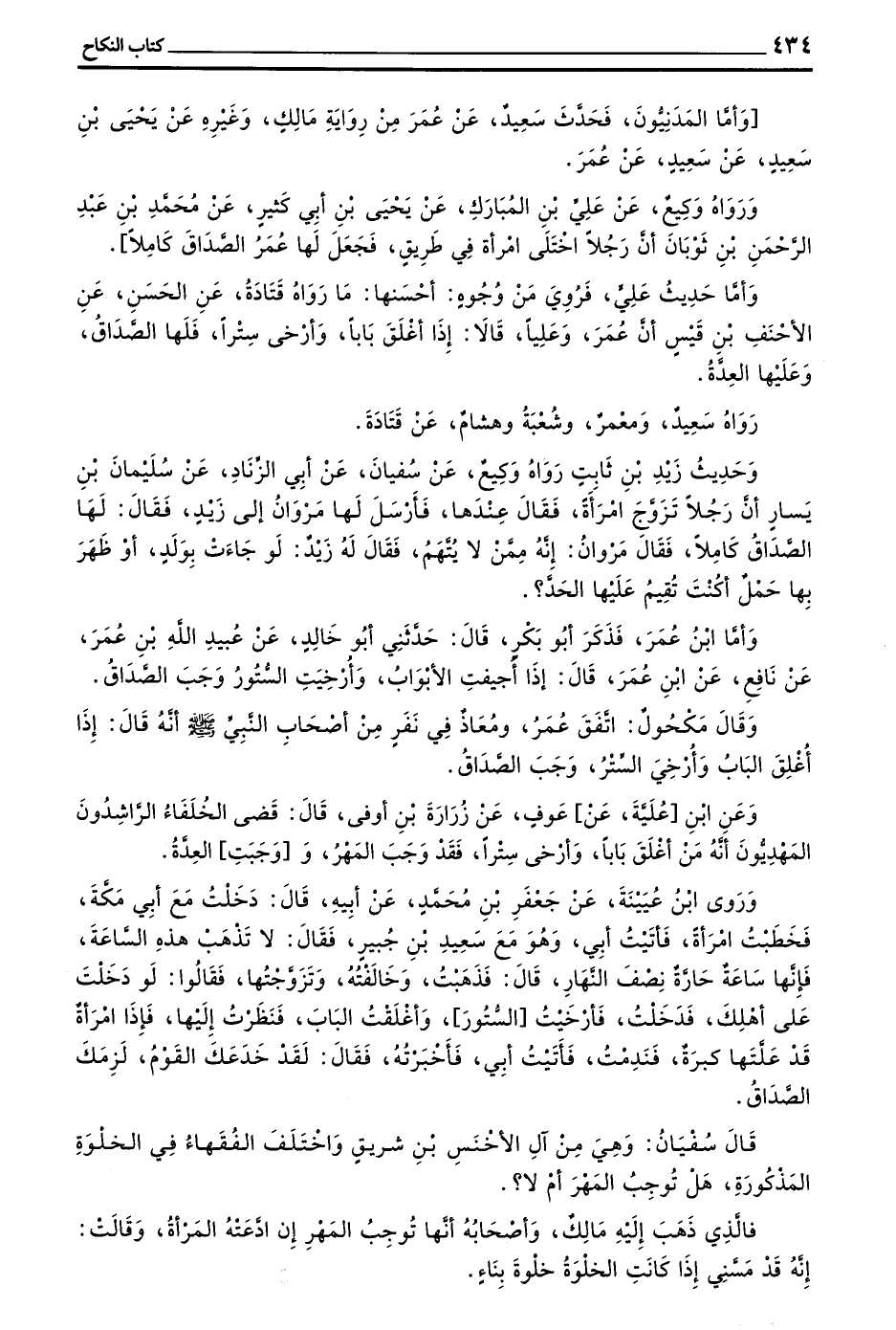 وَرَوَاهُ وَكِيعٌ عَنْ عَلِيِّ بْنِ الْمُبَارَكِ عَنْ يَحْيَى بْنِ أَبِي كَثِيرٍ عَنْ مُحَمَّدِ بْنِ عَبْدِ الرَّحْمَنِ بْنِ ثَوْبَانَ أن رجلا اختلى امراته فِي طَرِيقٍ فَجَعَلَ لَهَا عُمَرُ الصَّدَاقَ كَامِلًا