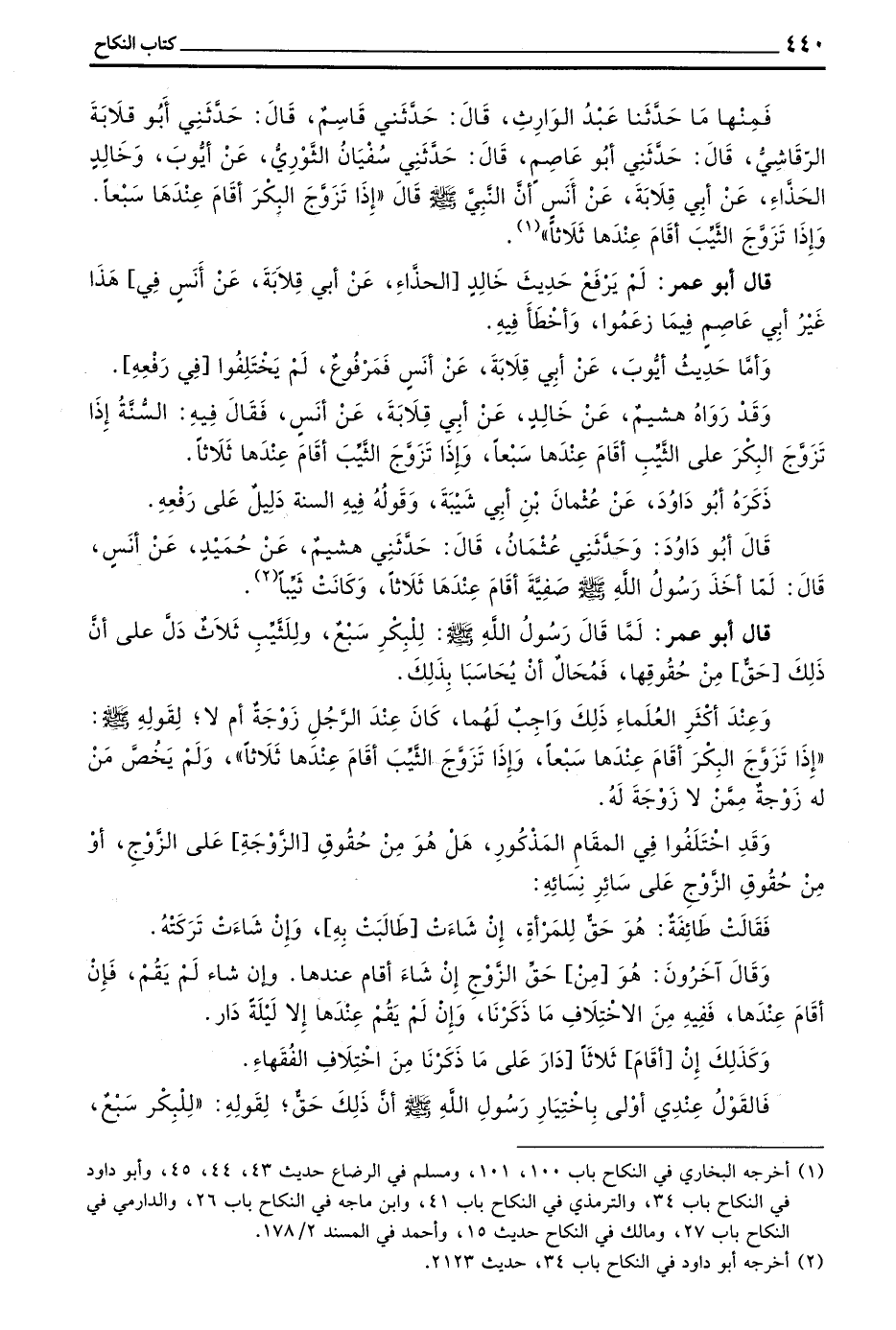 فَمِنْهَا مَا حَدَّثَنَا عَبْدُ الْوَارِثِ قَالَ حَدَّثَنِي قَاسِمٌ قَالَ حَدَّثَنِي أَبُو قِلَابَةَ الرَّقَاشِيُّ قَالَ حَدَّثَنِي أَبُو عَاصِمٍ قَالَ حَدَّثَنِي سُفْيَانُ الثَّوْرِيُّ عَنْ أَيُّوبَ وَخَالِدٌ الْحَذَّاءُ عَنْ أَبِي قِلَابَةَ عَنْ أَنَسٍ أَنَّ النَّبِيَّ صَلَّى اللَّهُ عَلَيْهِ وَسَلَّمَ قَالَ ((إِذَا تَزَوَّجَ الْبِكْرَ أَقَامَ عِنْدَهَا سَبْعًا وَإِذَا تَزَوَّجَ الثَّيِّبَ أَقَامَ عِنْدَهَا ثَلَاثًا))