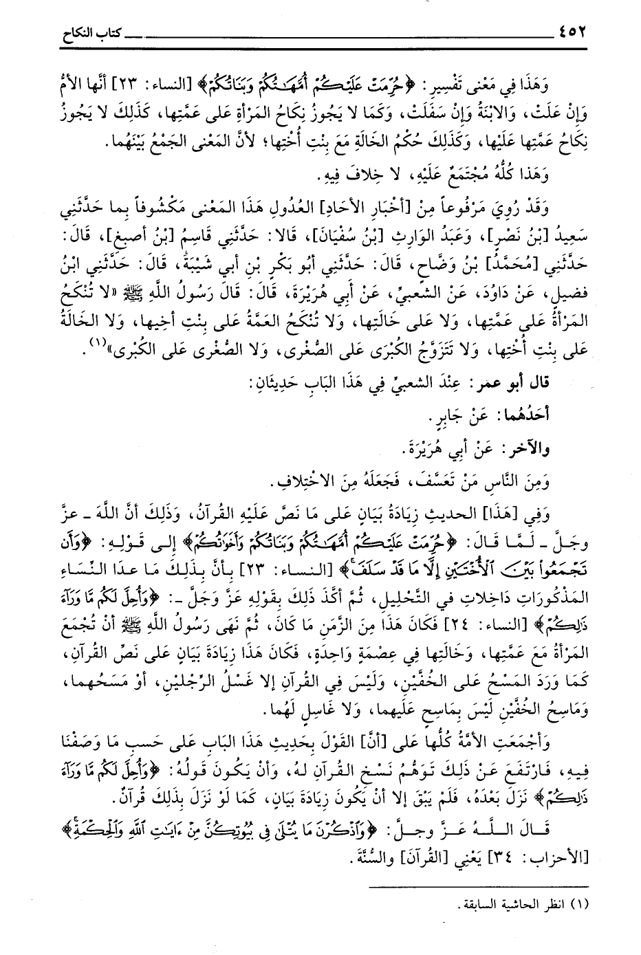 وَأَجْمَعَتِ الْأُمَّةُ كُلُّهَا عَلَى أَنَّ الْقَوْلَ بِحَدِيثِ هَذَا الْبَابِ عَلَى حَسَبِ مَا وَصَفْنَا فِيهِ فَارْتَفَعَ عَنْ ذَلِكَ تَوَهُّمُ نَسْخِ الْقُرْآنِ لَهُ وَأَنْ يَكُونَ قَوْلُهُ (وَأُحِلَّ لَكُمْ مَا وَرَاءَ ذَلِكُمْ) نَزَلَ بَعْدَهُ فَلَمْ يَبْقَ إِلَّا أَنْ يَكُونَ زِيَادَةَ بَيَانٍ كَمَا لَوْ نَزَلَ بِذَلِكَ قُرْآنٌ