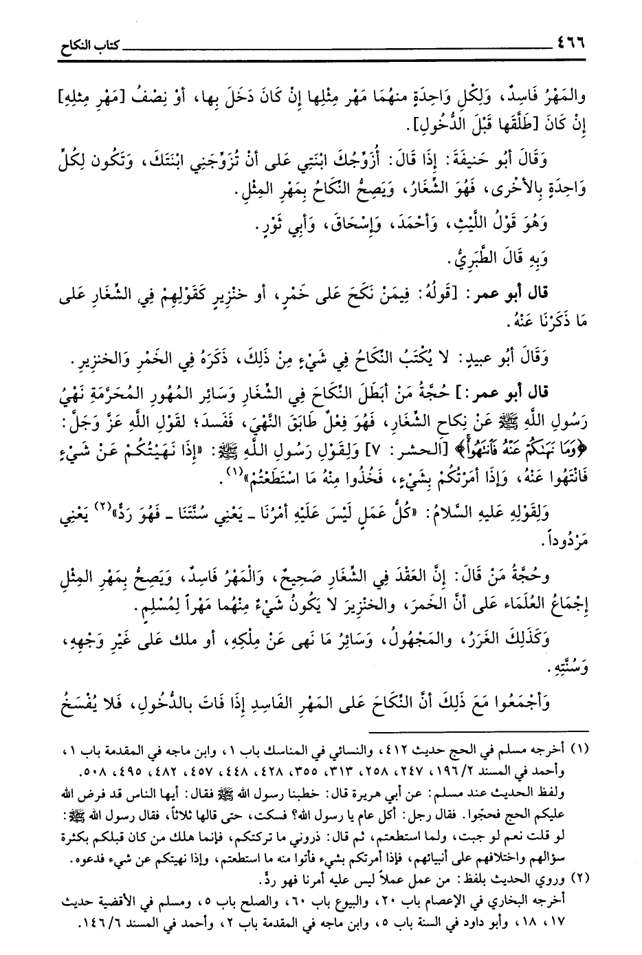 قَالَ أَبُو عُمَرَ حُجَّةُ مَنْ أَبْطَلَ النِّكَاحَ فِي الشِّغَارِ وَسَائِرِ الْمُهُورِ الْمُحَرَّمَةِ نَهْيُ رَسُولِ اللَّهِ صَلَّى اللَّهُ عَلَيْهِ وَسَلَّمَ عَنْ نِكَاحِ الشِّغَارِ فَهُوَ فِعْلٌ طَابَقَ النَّهْيَ فَفَسَدَ لِقَوْلِ اللَّهِ عَزَّ وَجَلَّ (وَمَا نَهَاكُمْ عَنْهُ فَانْتَهُوا) الْحَشْرِ 7 وَلِقَوْلِ رَسُولِ اللَّهِ صَلَّى اللَّهُ عَلَيْهِ وَسَلَّمَ ((إذا نَهَيْتُكُمْ عَنْ شَيْءٍ فَانْتَهُوا عَنْهُ وَإِذَا أَمَرْتُكُمْ بِشَيْءٍ فَخُذُوا مِنْهُ مَا اسْتَطَعْتُمْ))