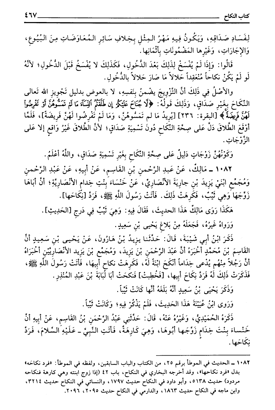 وَكَوْنُهُنَّ زَوْجَاتٍ دَلِيلٌ عَلَى صِحَّةِ النِّكَاحِ بِغَيْرِ تَسْمِيَةِ صَدَاقٍ وَاللَّهُ أَعْلَمُ 1082 - مَالِكٌ عَنْ عَبْدِ الرَّحْمَنِ بْنِ الْقَاسِمِ عَنْ أَبِيهِ عَنْ عَبْدِ الرَّحْمَنِ وَمَجْمَعٍ ابْنَيْ يَزِيدَ بْنِ جَارِيَةَ الْأَنْصَارِيِّ عَنْ خَنْسَاءَ بِنْتِ خِدَامٍ الْأَنْصَارِيَّةِ أَنَّ أَبَاهَا زَوَّجَهَا وَهِيَ ثَيِّبٌ فَكَرِهَتْ ذَلِكَ فَأَتَتْ رَسُولَ اللَّهِ صَلَّى اللَّهُ عَلَيْهِ وَسَلَّمَ فَرَدَّ نِكَاحَهَا