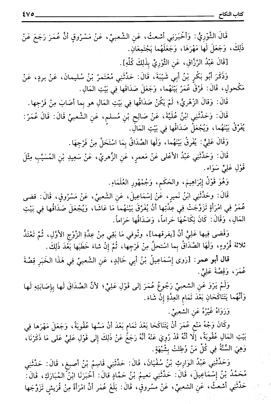 قال وحدثني بن نُمَيْرٍ عَنْ إِسْمَاعِيلَ عَنِ الشَّعْبِيِّ عَنْ مَسْرُوقٍ قَالَ قَضَى عُمَرُ فِي امْرَأَةٍ تَزَوَّجَتْ فِي عِدَّتِهَا أَنْ يُفَرَّقَ بَيْنَهُمَا مَا عَاشَا وَيُجْعَلَ صَدَاقُهَا فِي بَيْتِ الْمَالِ وَقَالَ كَانَ نِكَاحُهَا حَرَامًا وَصَدَاقُهَا حَرَامًا