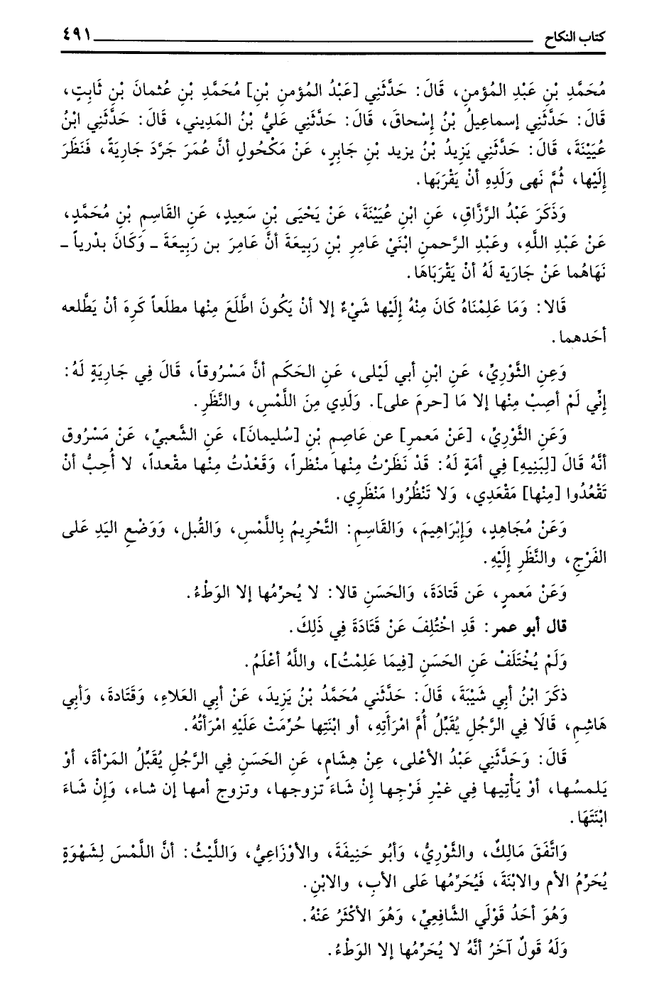 وَعَنِ الثوري عن بن أَبِي لَيْلَى عَنِ الْحَكَمِ أَنَّ مَسْرُوقًا قَالَ فِي جَارِيَةٍ لَهُ إِنِّي لَمْ أُصِبْ مِنْهَا إِلَّا مَا حَرُمَ عَلَى وَلَدِي مِنَ اللَّمْسِ وَالنَّظَرِ