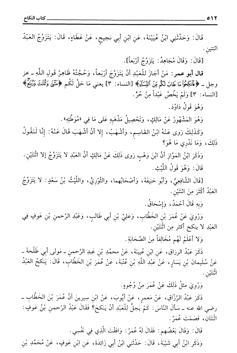 قَالَ أَبُو عُمَرَ مَنْ أَجَازَ لِلْعَبْدِ أَنْ يَتَزَوَّجَ أَرْبَعًا وَحُجَّتُهُ ظَاهِرُ قَوْلِ اللَّهِ - عَزَّ وَجَلَّ (فَانْكِحُوا مَا طَابَ لَكُمْ مِنَ النِّسَاءِ) النِّسَاءِ 3 يَعْنِي مَا حَلَّ لَكُمْ (مَثْنَى وَثُلَاثَ وَرُبَاعَ) النِّسَاءِ 3 وَلَمْ يَخُصَّ عَبْدًا مِنْ حُرٍّ