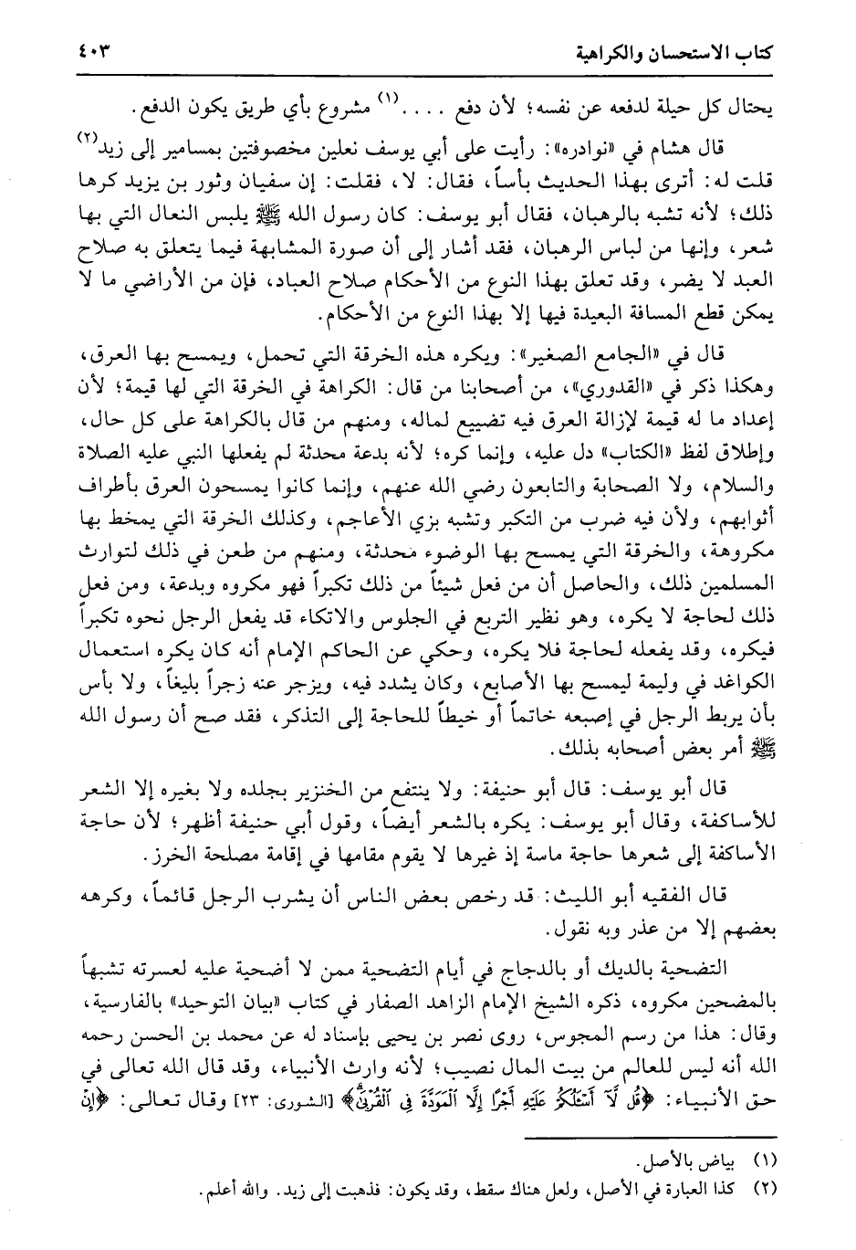 قال هشام في «نوادره» : رأيت على أبي يوسف نعلين مخصوفتين بمسامير إلى زيد قلت له: أترى بهذا الحديث بأساً، فقال: لا، فقلت: إن سفيان وثور بن يزيد كرها ذلك؛ لأنه تشبه بالرهبان، فقال أبو يوسف: كان رسول الله صلى الله عليه وسلم يلبس النعال التي بها شعر، وإنها من لباس الرهبان، فقد أشار إلى أن صورة المشابهة فيما يتعلق به صلاح العبد لا يضر، وقد تعلق بهذا النوع من الأحكام صلاح العباد، فإن من الأراضي ما لا يمكن قطع المسافة البعيدة فيها إلا بهذا النوع من الأحكام.