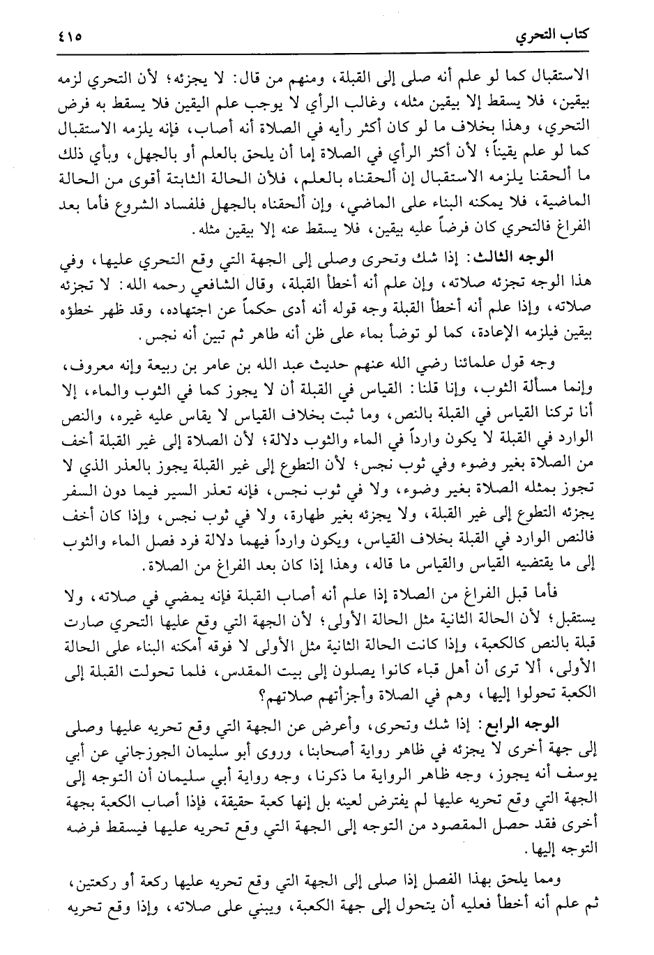 الوجه الرابع: إذا شك وتحرى، وأعرض عن الجهة التي وقع تحريه عليها وصلى إلى جهة أخرى لا يجزئه في ظاهر رواية أصحابنا، وروى أبو سليمان الجوزجاني عن أبي يوسف أنه يجوز، وجه ظاهر الرواية ما ذكرنا، وجه رواية أبي سليمان أن التوجه إلى الجهة التي وقع تحريه عليها لم يفترض لعينه بل إنها كعبة حقيقة، فإذا أصاب الكعبة بجهة أخرى فقد حصل المقصود من التوجه إلى الجهة التي وقع تحريه عليها فيسقط فرضه التوجه إليها.