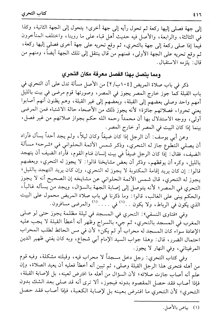 وعن أبي يوسف: أن الرجل إذا كان ضيفاً وكان ليلاً، ولم يجد أحداً يسأل فأراد أن يصلي التطوع جاز له التحري، وذكر شمس الأئمة الحلواني في «شرحه» مسألة الضيف، فقال: إذا كان الرجل ضيفاً في بيت إنسان فنام القوم، فأراد الضيف أن يتهجد بالليل، وكره أن يوقظهم، وذكر أن بعض مشايخنا قالوا: لا يجوز له التحري، وبعضهم قالوا: إن كان يريد إقامة المكتوبة لا يجوز له التحري، وإن كان يريد التهجد بالليل؛ يجوز له التحري، قال شمس الأئمة الحلواني عن مشايخه إن الصحيح أنه لا يجوز التحري في المصر؛ لأنه يتوصل إلى إصابة الجهة بالسؤال، ويجد من يسأله غالباً، والحكم يبنى على الغالب، قالوا: وما ذكرنا في باب صلاة المريض محمول على البيت الذي يكون في الرباط، ولا يكون.. في.... والمرضى مسافرون.
