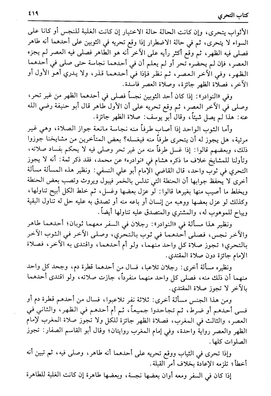 وأما الثوب الواحد إذا أصاب طرفاً منه نجاسة مانعة جواز الصلاة، وهي غير مرئية، هل يجوز له أن يتحرى طرفاً منه فيغسله؟ بعض المتأخرين من مشايخنا جوزوا ذلك، وبعضهم قالوا: إذا غسل طرفاً منه من غير تحر وصلى فيه لا يحكم بفساد صلاته، وتأولنا للمشايخ خلاف ما ذكره هشام في «نوادره» عن محمد، فقد ذكر ثمة: أنه لا يجوز التحري في ثوب واحد، قال القاضي الإمام أبو علي النسفي: ونظير هذه المسألة مسألة أخرى لا يحفظ جوابها أن الحنطة التي تدلس بالخمر فيبول ويروث وتصب بعض الحنطة ويخلط ما أصيب منها بغيرها قالوا: لو عزل بعضها وغسل، ثم خلط الكل أبيح تناولها، وكذلك لو عزل بعضها ووهبه من إنسان أو باعه منه أو تصدق به عليه حل له تناول البقية ويباح للموهوب له، والمشتري والمتصدق عليه تناولها أيضاً.