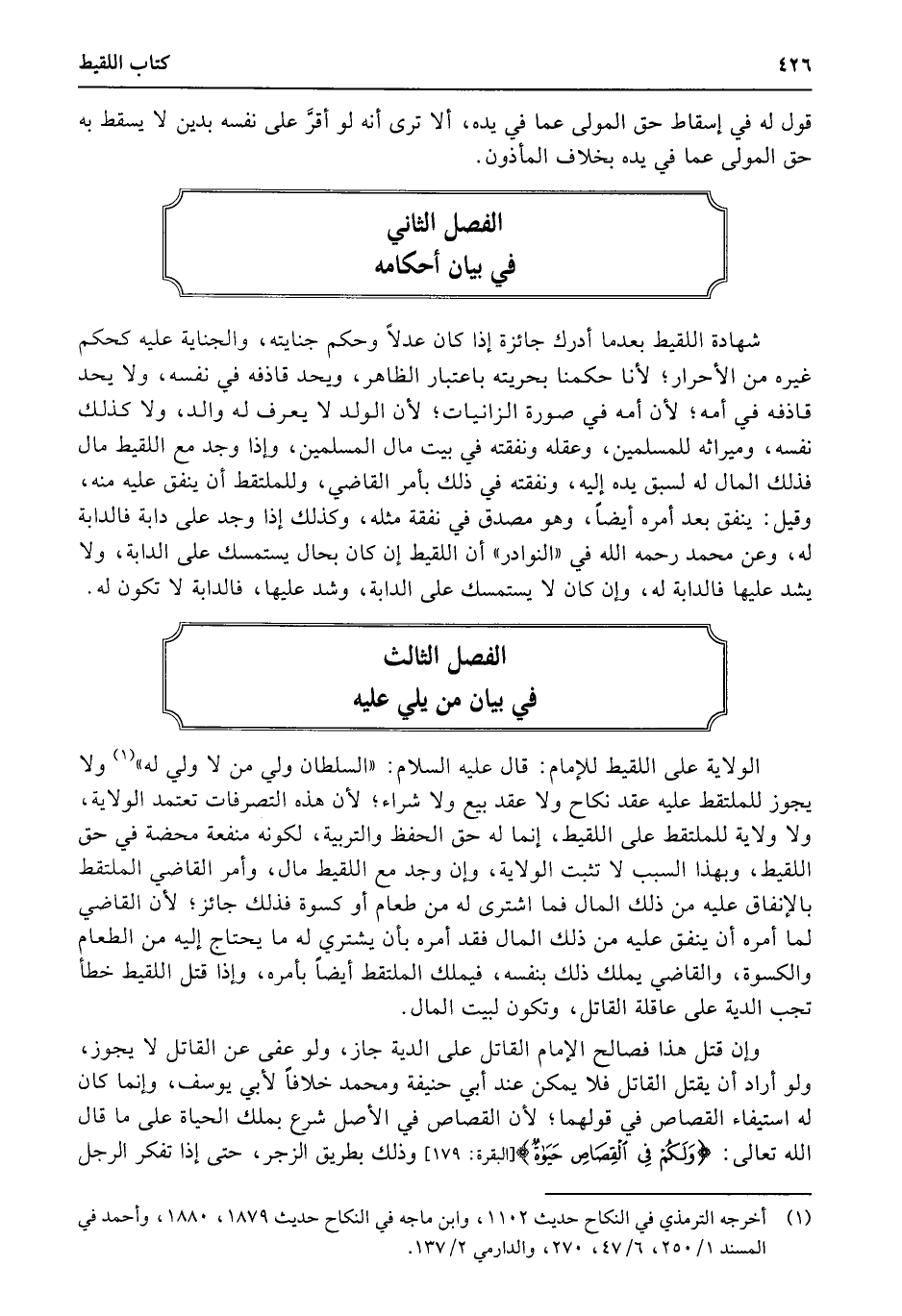 الولاية على اللقيط للإمام: قال عليه السلام: «السلطان ولي من لا ولي له» ولا يجوز للملتقط عليه عقد نكاح ولا عقد بيع ولا شراء؛ لأن هذه التصرفات تعتمد الولاية، ولا ولاية للملتقط على اللقيط، إنما له حق الحفظ والتربية، لكونه منفعة محضة في حق اللقيط، وبهذا السبب لا تثبت الولاية، وإن وجد مع اللقيط مال، وأمر القاضي الملتقط بالإنفاق عليه من ذلك المال فما اشترى له من طعام أو كسوة فذلك جائز؛ لأن القاضي لما أمره أن ينفق عليه من ذلك المال فقد أمره بأن يشتري له ما يحتاج إليه من الطعام والكسوة، والقاضي يملك ذلك بنفسه، فيملك الملتقط أيضاً بأمره، وإذا قتل اللقيط خطأ تجب الدية على عاقلة القاتل، وتكون لبيت المال.