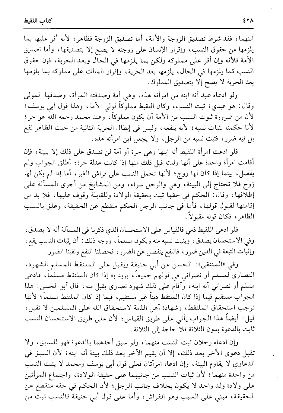 وفي «المنتقى» : الحسن عن أبي حنيفة ويقبل على الملتقط المسلم الشهود، النصارى لمسلم أو نصراني في قولهم جميعاً، يريد به إذا كان الملتقط مسلماً، فادعى مسلم أو نصراني أنه ابنه، وأقام على ذلك شهود نصارى يقبل منه، قال أبو الحسن: هذا الجواب مستقيم فيما إذا كان الملتقط ديناً غير مستقيم، فيما إذا كان الملتقط مسلماً؛ لأنها توجب استحقاق الملتقط، وشهادة أهل الذمة لاستحقاق الله على المسلمين لا تقبل، قيل: أيضاً هذا الجواب يأتي على طريق القياس؛ لأن على طريق الاستحسان النسب ثابت بالدعوة بدون الثلاثة فلا حاجة إلى الثلاثة.