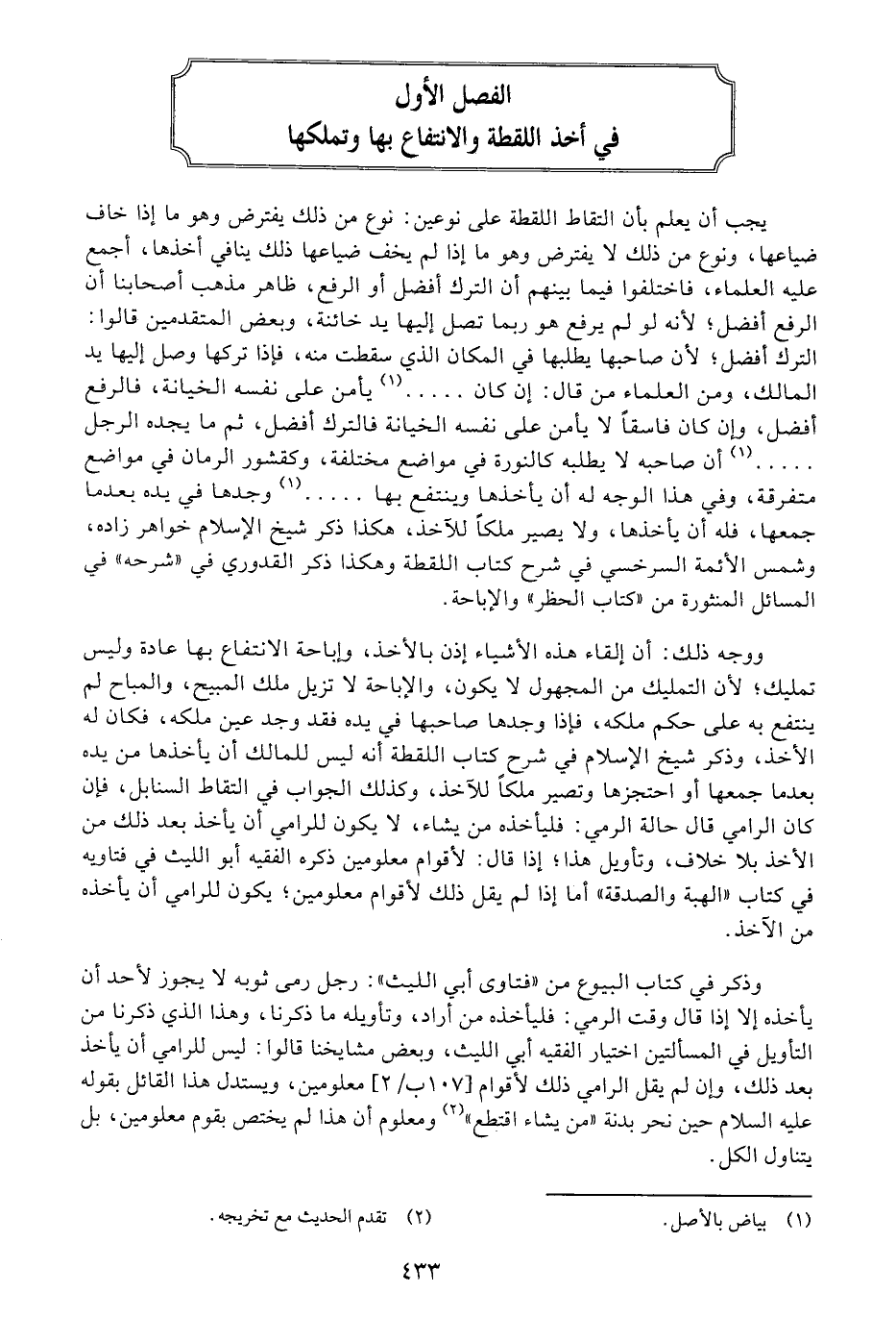 الفصل الأول في أخذ اللقطة والانتفاع بها وتملكها