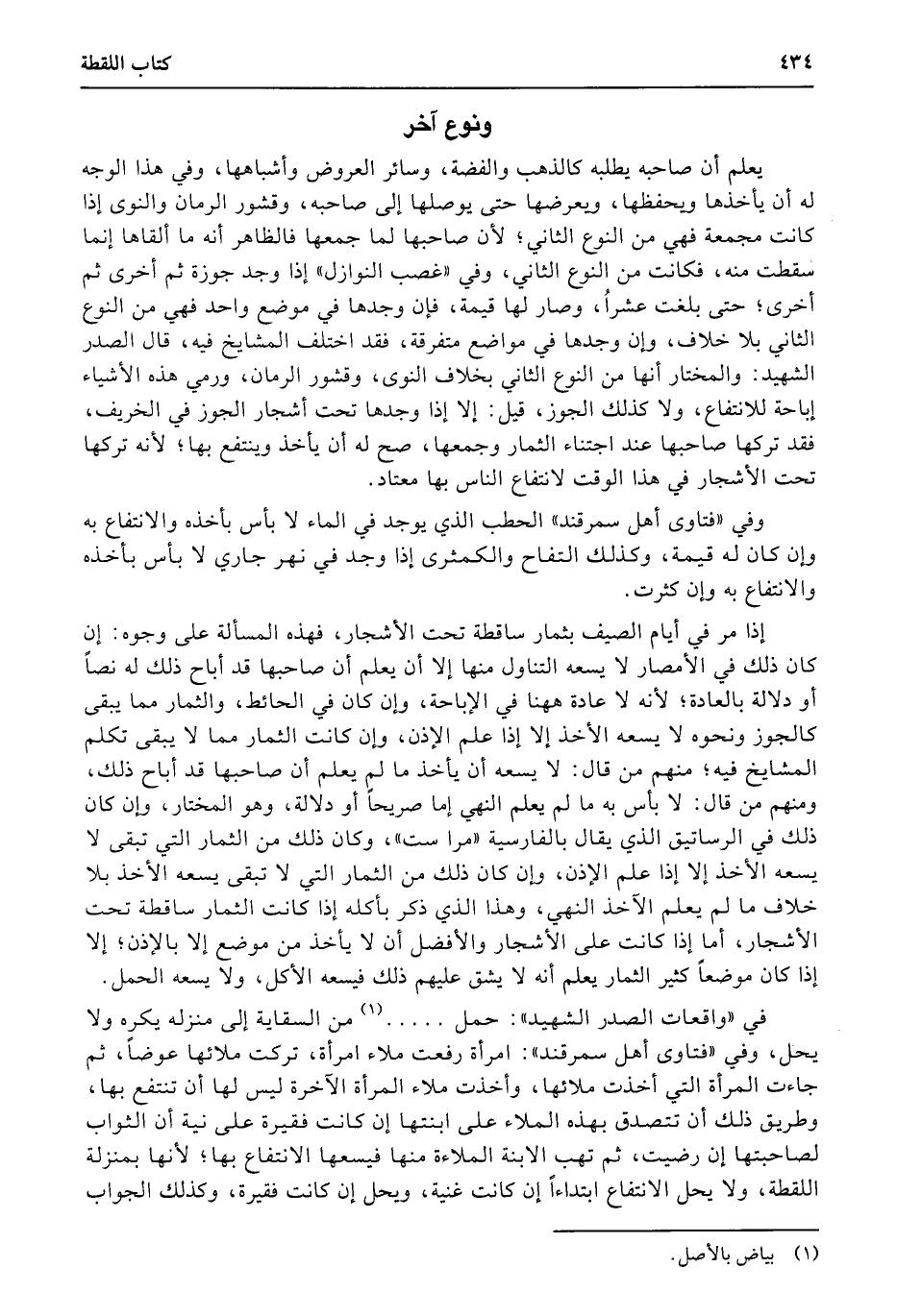 يعلم أن صاحبه يطلبه كالذهب والفضة، وسائر العروض وأشباهها، وفي هذا الوجه له أن يأخذها ويحفظها، ويعرضها حتى يوصلها إلى صاحبه، وقشور الرمان والنوى إذا كانت مجمعة فهي من النوع الثاني؛ لأن صاحبها لما جمعها فالظاهر أنه ما ألقاها إنما سقطت منه، فكانت من النوع الثاني، وفي «غصب النوازل» إذا وجد جوزة ثم أخرى ثم أخرى؛ حتى بلغت عشراً، وصار لها قيمة، فإن وجدها في موضع واحد فهي من النوع الثاني بلا خلاف، وإن وجدها في مواضع متفرقة، فقد اختلف المشايخ فيه، قال الصدر الشهيد: والمختار أنها من النوع الثاني بخلاف النوى، وقشور الرمان، ورمي هذه الأشياء إباحة للانتفاع، ولا كذلك الجوز، قيل: إلا إذا وجدها تحت أشجار الجوز في الخريف، فقد تركها صاحبها عند اجتناء الثمار وجمعها، صح له أن يأخذ وينتفع بها؛ لأنه تركها تحت الأشجار في هذا الوقت لانتفاع الناس بها معتاد.
