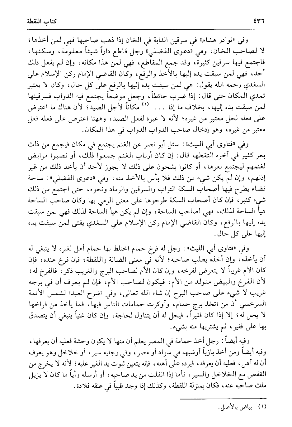 وفي «فتاوى أبي الليث» : سئل أبو نصر عن الغنم يجتمع في مكان فيجمع من ذلك بعر كثير في آخره التقطها قال: إن كان أرباب الغنم جمعوا ذلك، أو نصبوا مرابض لغنمهم ليجتمع بعرها، أو كانوا يشحون على ذلك لا يجوز لأحد أن يأخذ ذلك من غير إذنهم، وإن لم يكن شيء من ذلك فلا بأس بالأخذ منه، وفي «دعوى الفضلي» : ساحة فضاء يطرح فيها أصحاب السكة التراب والسرقين والرماد ونحوه، حتى اجتمع من ذلك شيء كثير، فإن كان أصحاب السكة طرحوها على معنى الرمي بها وكان صاحب الساحة هيأ الساحة لذلك، فهي لصاحب الساحة، وإن لم يكن هيأ الساحة لذلك فهي لمن سبقت يده إليها بالرفع، وكان القاضي الإمام ركن الإسلام علي السغدي يفتي لمن سبقت يده إليها على كل حال.