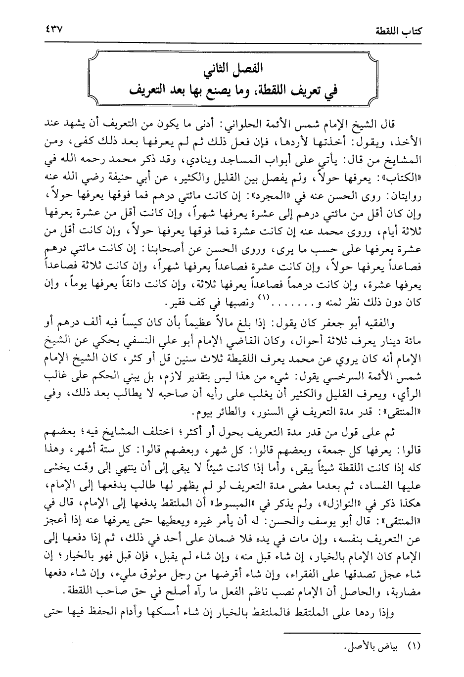 والفقيه أبو جعفر كان يقول: إذا بلغ مالاً عظيماً بأن كان كيساً فيه ألف درهم أو مائة دينار يعرف ثلاثة أحوال، وكان القاضي الإمام أبو علي النسفي يحكي عن الشيخ الإمام أنه كان يروي عن محمد يعرف اللقيطة ثلاث سنين قل أو كثر، كان الشيخ الإمام شمس الأئمة السرخسي يقول: شيء من هذا ليس بتقدير لازم، بل يبني الحكم على غالب الرأي، ويعرف القليل والكثير أن يغلب على رأيه أن صاحبه لا يطالب بعد ذلك، وفي «المنتقى» : قدر مدة التعريف في السنور، والطائر بيوم.