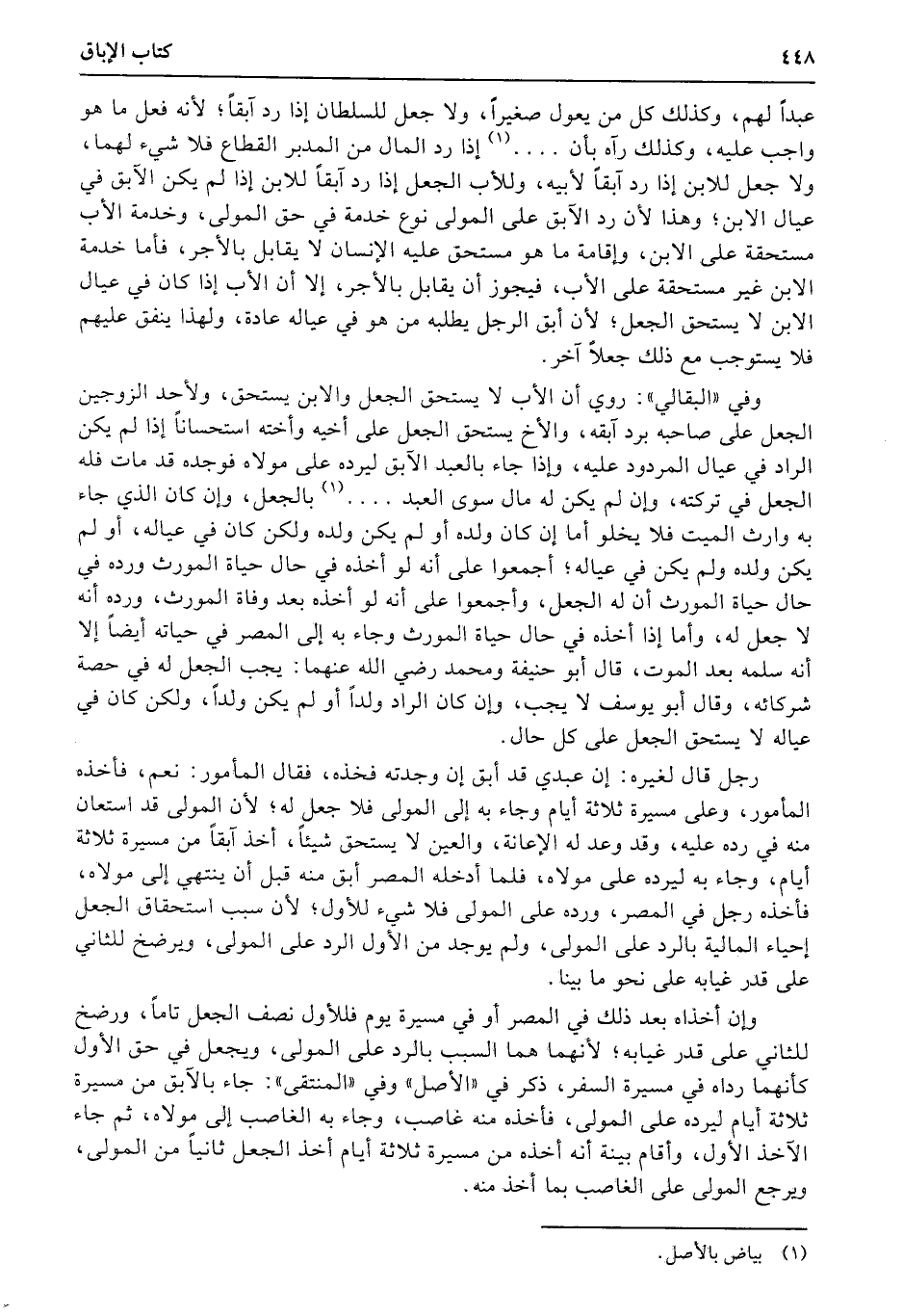 عبداً لهم، وكذلك كل من يعول صغيراً، ولا جعل للسلطان إذا رد آبقاً؛ لأنه فعل ما هو واجب عليه، وكذلك رآه بأن.... إذا رد المال من المدبر القطاع فلا شيء لهما، ولا جعل للابن إذا رد آبقاً لأبيه، وللأب الجعل إذا رد آبقاً للابن إذا لم يكن الآبق في عيال الابن؛ وهذا لأن رد الآبق على المولى نوع خدمة في حق المولى، وخدمة الأب مستحقة على الابن، وإقامة ما هو مستحق عليه الإنسان لا يقابل بالأجر، فأما خدمة الابن غير مستحقة على الأب، فيجوز أن يقابل بالأجر، إلا أن الأب إذا كان في عيال الابن لا يستحق الجعل؛ لأن أبق الرجل يطلبه من هو في عياله عادة، ولهذا ينفق عليهم فلا يستوجب مع ذلك جعلاً آخر.