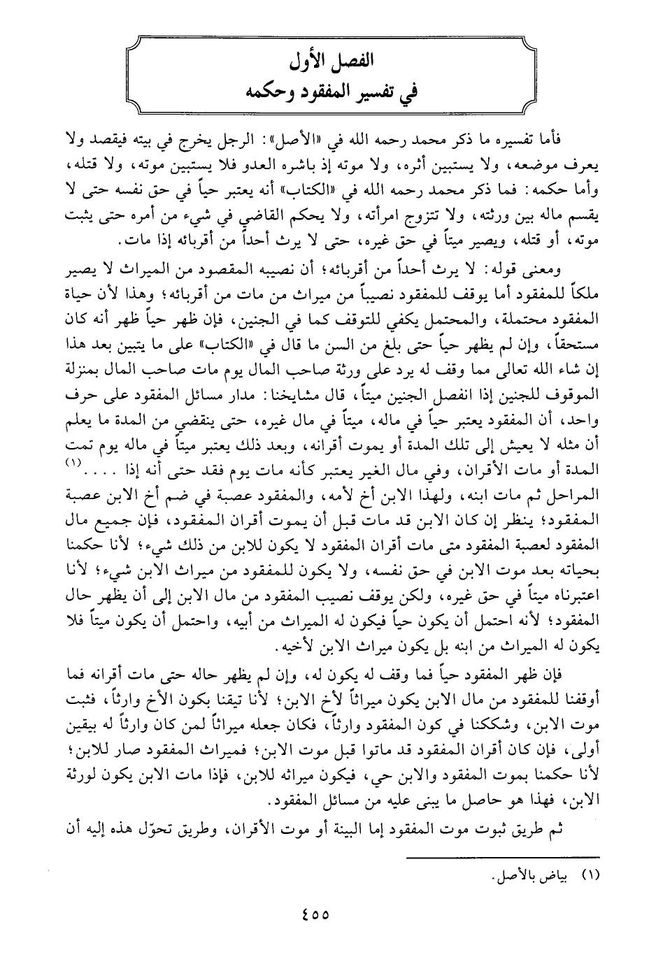 فأما تفسيره ما ذكر محمد رحمه الله في «الأصل» : الرجل يخرج في بيته فيقصد ولا يعرف موضعه، ولا يستبين أثره، ولا موته إذ باشره العدو فلا يستبين موته، ولا قتله، وأما حكمه: فما ذكر محمد رحمه الله في «الكتاب» أنه يعتبر حياً في حق نفسه حتى لا يقسم ماله بين ورثته، ولا تتزوج امرأته، ولا يحكم القاضي في شيء من أمره حتى يثبت موته، أو قتله، ويصير ميتاً في حق غيره، حتى لا يرث أحداً من أقربائه إذا مات.