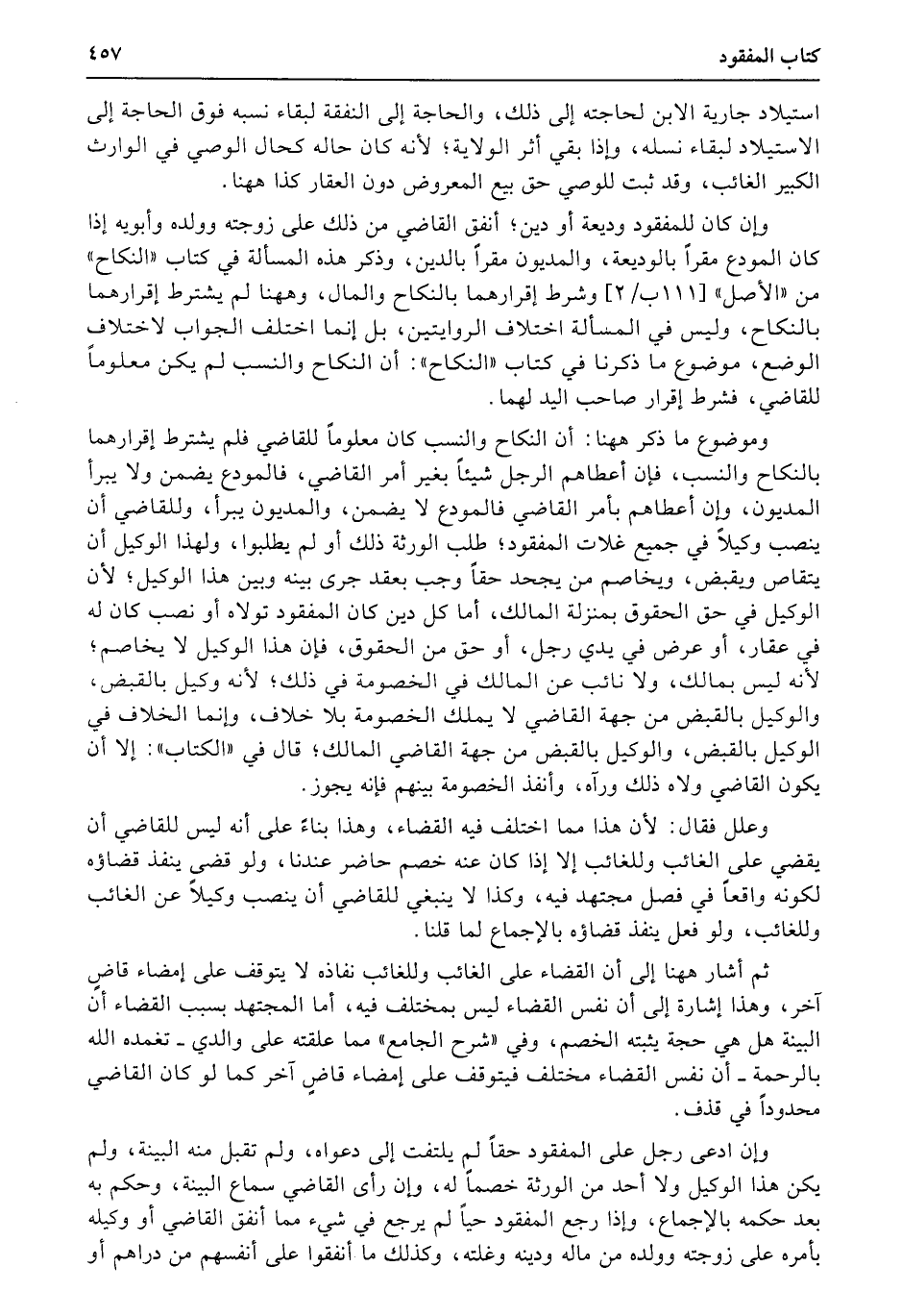وموضوع ما ذكر ههنا: أن النكاح والنسب كان معلوماً للقاضي فلم يشترط إقرارهما بالنكاح والنسب، فإن أعطاهم الرجل شيئاً بغير أمر القاضي، فالمودع يضمن ولا يبرأ المديون، وإن أعطاهم بأمر القاضي فالمودع لا يضمن، والمديون يبرأ، وللقاضي أن ينصب وكيلاً في جميع غلات المفقود؛ طلب الورثة ذلك أو لم يطلبوا، ولهذا الوكيل أن يتقاص ويقبض، ويخاصم من يجحد حقاً وجب بعقد جرى بينه وبين هذا الوكيل؛ لأن الوكيل في حق الحقوق بمنزلة المالك، أما كل دين كان المفقود تولاه أو نصب كان له في عقار، أو عرض في يدي رجل، أو حق من الحقوق، فإن هذا الوكيل لا يخاصم؛ لأنه ليس بمالك، ولا نائب عن المالك في الخصومة في ذلك؛ لأنه وكيل بالقبض، والوكيل بالقبض من جهة القاضي لا يملك الخصومة بلا خلاف، وإنما الخلاف في الوكيل بالقبض، والوكيل بالقبض من جهة القاضي المالك؛ قال في «الكتاب» : إلا أن يكون القاضي ولاه ذلك ورآه، وأنفذ الخصومة بينهم فإنه يجوز.