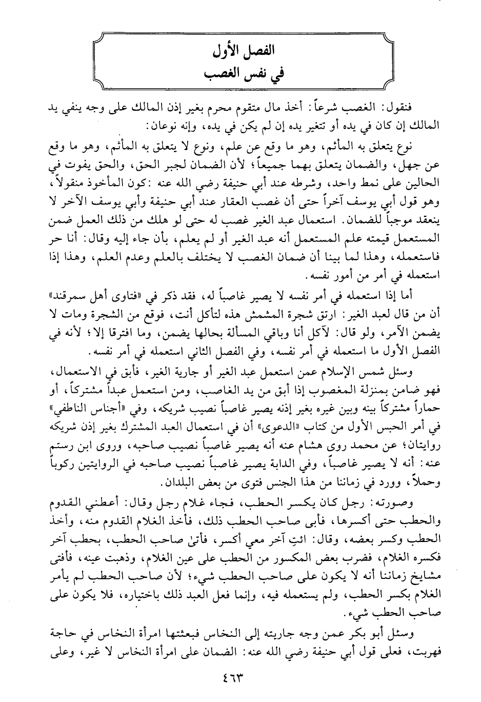 نوع يتعلق به المأثم، وهو ما وقع عن علم، ونوع لا يتعلق به المأثم، وهو ما وقع عن جهل، والضمان يتعلق بهما جميعاً؛ لأن الضمان لجبر الحق، والحق يفوت في الحالين على نمط واحد، وشرطه عند أبي حنيفة رضي الله عنه: كون المأخوذ منقولاً، وهو قول أبي يوسف آخراً حتى إن غصب العقار عند أبي حنيفة وأبي يوسف الآخر لا ينعقد موجباً للضمان. استعمال عبد الغير غصب له حتى لو هلك من ذلك العمل ضمن المستعمل قيمته علم المستعمل أنه عبد الغير أو لم يعلم، بأن جاء إليه وقال: أنا حر فاستعمله، وهذا لما بينا أن ضمان الغصب لا يختلف بالعلم وعدم العلم، وهذا إذا استعمله في أمر من أمور نفسه.