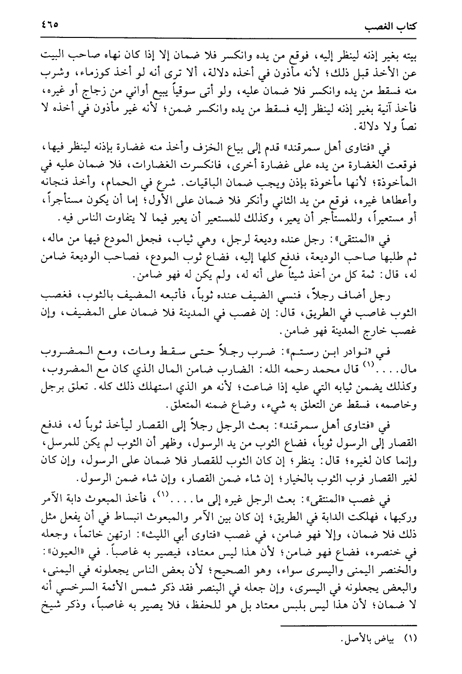 بيته بغير إذنه لينظر إليه، فوقع من يده وانكسر فلا ضمان إلا إذا كان نهاه صاحب البيت عن الأخذ قبل ذلك؛ لأنه مأذون في أخذه دلالة، ألا ترى أنه لو أخذ كوزماء، وشرب منه فسقط من يده وانكسر فلا ضمان عليه، ولو أتى سوقياً يبيع أواني من زجاج أو غيره، فأخذ آنية بغير إذنه لينظر إليه فسقط من يده وانكسر ضمن؛ لأنه غير مأذون في أخذه لا نصاً ولا دلالة.