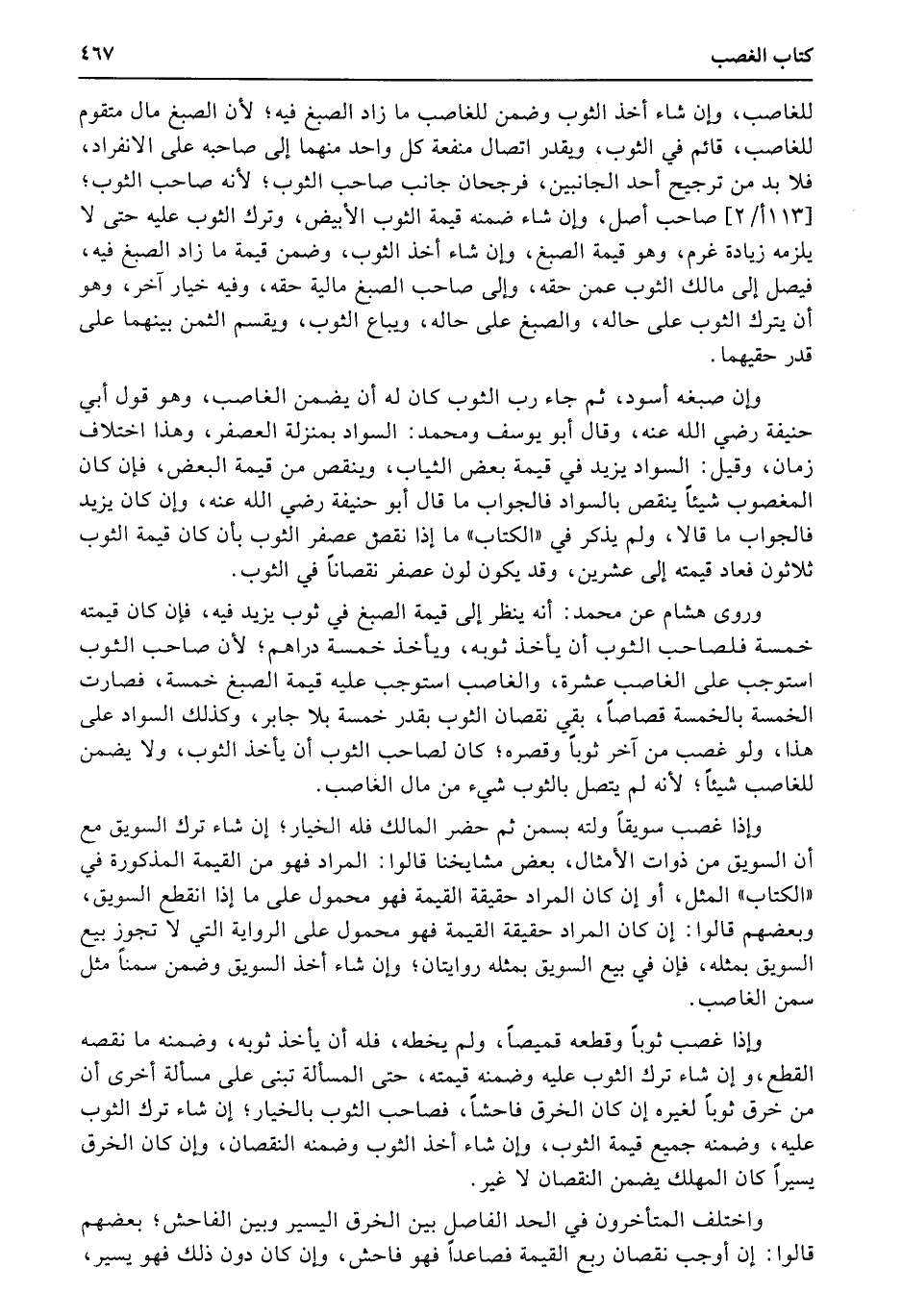 وإن صبغه أسود، ثم جاء رب الثوب كان له أن يضمن الغاصب، وهو قول أبي حنيفة رضي الله عنه، وقال أبو يوسف ومحمد: السواد بمنزلة العصفر، وهذا اختلاف زمان، وقيل: السواد يزيد في قيمة بعض الثياب، وينقص من قيمة البعض، فإن كان المغصوب شيئاً ينقص بالسواد فالجواب ما قال أبو حنيفة رضي الله عنه، وإن كان يزيد فالجواب ما قالا، ولم يذكر في «الكتاب» ما إذا نقص عصفر الثوب بأن كان قيمة الثوب ثلاثون فعاد قيمته إلى عشرين، وقد يكون لون عصفر نقصاناً في الثوب.