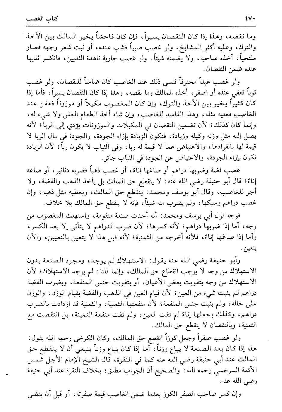 غصب فضة وضربها دراهم أو صاغها إناءً، أو غصب ذهباً فضربه دنانير، أو صاغه إناءً؛ قال أبو حنيفة رضي الله عنه: لا ينقطع حق المالك بل يأخذ الذهب والفضة، ولا أجر للغاصب، وقال أبو يوسف ومحمد: ينقطع حق المالك، ويعطيه مثل ذهبه، وإن غصب دراهم وسبكها، ولم يضرب منه شيئاً، فإنه لا ينقطع حق المالك بلا خلاف.