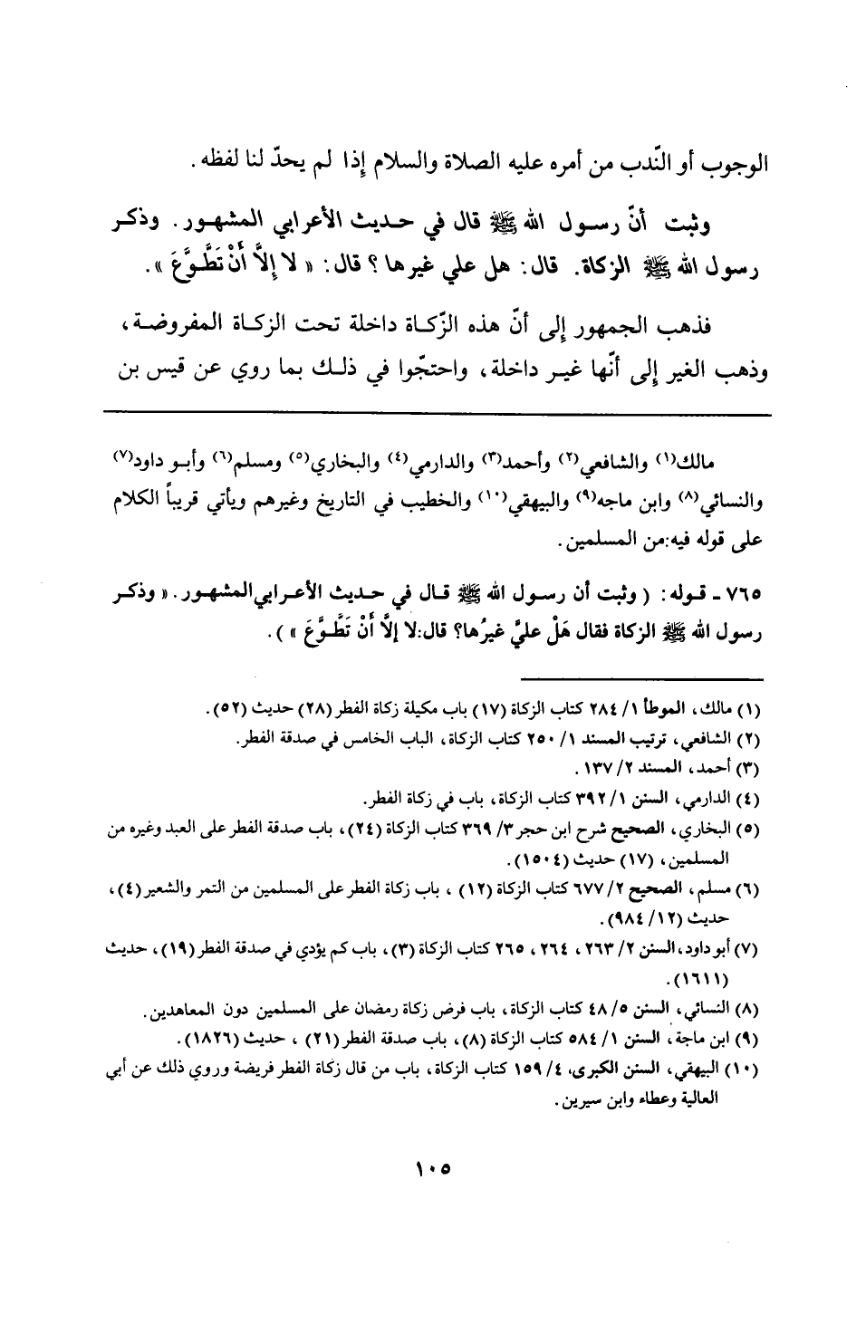 765 - قوله: (وثبت أن رسول الله - صلى الله عليه وسلم - قال في حديث الأعرابي المشهور. "وذكر رسول الله - صلى الله عليه وسلم - الزكاة فقال هَلْ عليَّ غيرُها؟ قال: لا إلَّا أنْ تطوعَ").