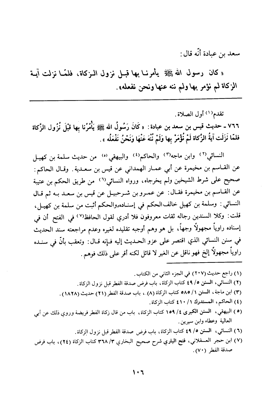 766 - حديث قيس بن سعد بن عبادة: "كَانَ رَسُولُ الله - صلى الله عليه وسلم - يَأمُرُنا بِها قبْلَ نُزُول الزّكاة فلمّا نَزَلَت آيةُ الزكاة لَمْ نُؤْمَرْ بِها وَلَمْ نُنْهَ عَنْهَا وَنَحْنُ نَفْعَلُه".